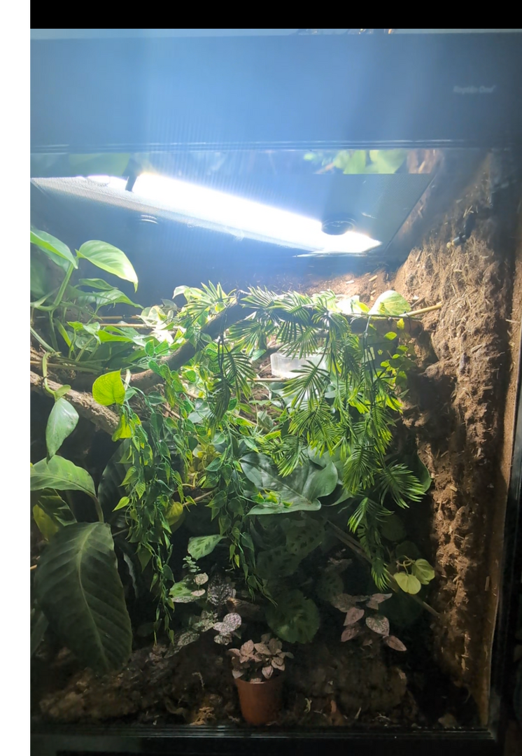Hi guys, had my female panther a little while now, close to 4 weeks, I think I have finally came close to finishing her enclosure, what would you guys change to make it better? Lighting is arcadia luminize t5 6%, jungle dawn and 60w basking lamp, I have a automatic mister that runs for a few mins 30 mins after lights go out (so mister runs at 7.30pm) then a mars hydro fogger runs from midnite for 20 mins intervals with an hour break in between, last fogg is at around 6am, then sunrise is at 7am, with basking bulb coming on at 7.30am at 26°c then drops to 24°c at 3pm, then 22°at 5pm then obviously off from 7pm, dripper turns on at 8am and runs for 5 hours at a rate of around 1 drop every 2 seconds, all water into the enclosure is ro water too, daytime humidity is around 55% at the moment and night humidity is between 90-100%, live plants are ficus, 3 different pothos, umbrella tree, monstera, prayer plant, jungle velvet, weeping fig, creeping fig and a couple of polka dot plants, I have fans putting fresh air into the bottom of the enclosure and fans on top of the screen top for good circulation, wondering if there's anything I can add or change to make it better for her, or if there's ideas of how I could have done things differently.