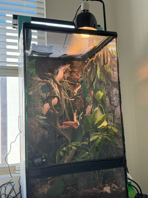 My questions: overall thoughts on this setup? Namely, light position, intensity, hydration (misting schedule and amount, adding a water dripper, a reptizoo water dispenser), etc? Reddit says I’m going to kill this because of the substrate and a glass enclosure but all the articles and threads here contradict this. Just want to provide a good home while also trying to meet the goals I have set up for the design we would like. While we would extremely prefer not to get a new enclosure given what this cost, we would if needed and see a Reptizoo one that has 6” of screen on each side panel along with a screen top that could be a candidate (but $590 plus fitting it out).