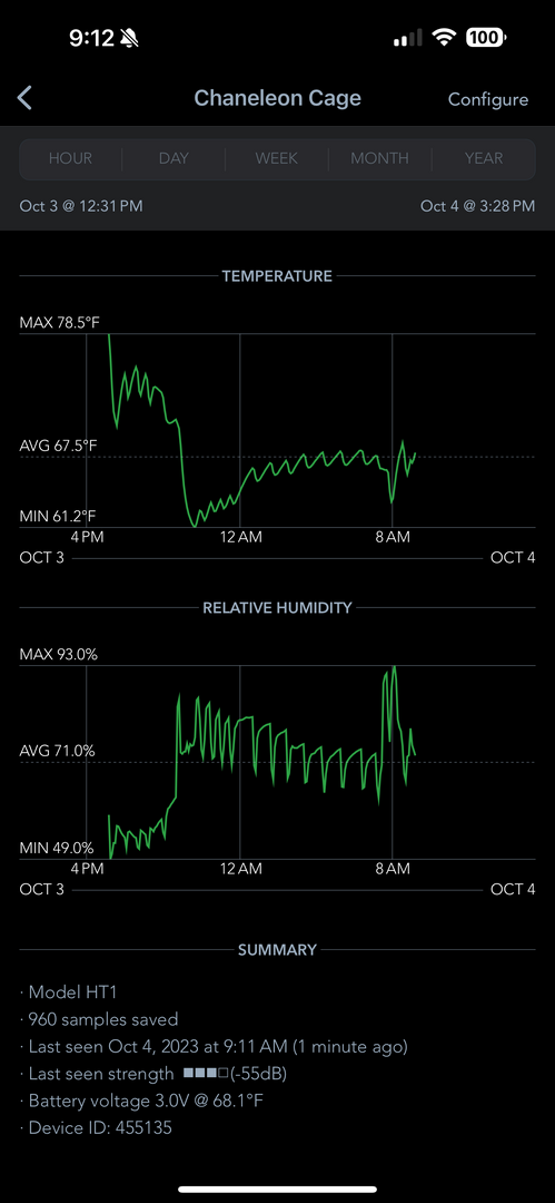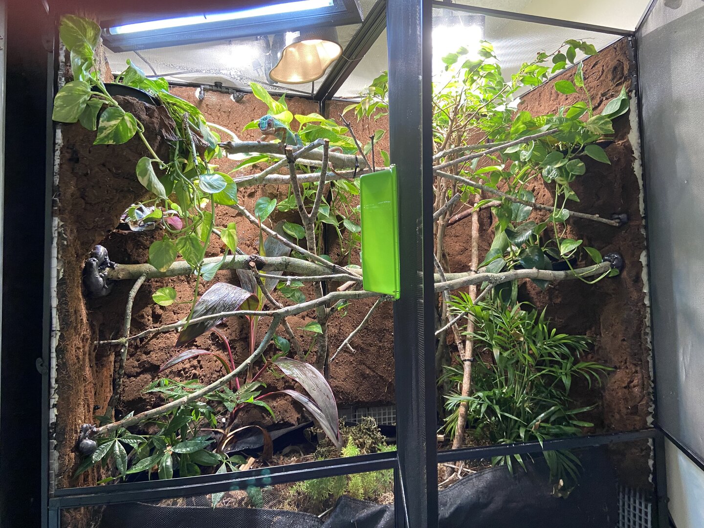 Yes it’s a glass enclosure with a screen top and ventilation slots on the front. I added a SensorPush into it in a middle spot to have continuous data but it’s fresh so not a ton yet. From constant checking, I see ambient temps in the 72-77 during the day and low 50s humidity going to 65 and 80s humidity after lights out. I am trying the water cup gimmick because I feel more opportunities to drink the better so why not (keeping it clean). All water is RODI made at home. It has a T8 UVB 5.0 that’s lifted about 4.5” off the top mesh of the enclosure while a 3D printed stand is being ordered. The basking lamp is a 60w incandescent (swapped from the blue tinted (but white light) 40/45 bulb the store got me to get) which results in I believe high 80s basking at the top. (When he’s not up there I’ll try to move a sensor there to see. An infrared heat gun puts the exo Tera vine at like 80-85, wood gets hotter, the skin of the actual chameleon can get much higher when basking directly but not sure if that’s because overall absorption or what a normal temp should be on the actual animal). The lamp is height adjustable so I can rise as needed if too hot or bring down as well. I bought and will add two more exo terra vines for more climbing space in front and back and will replace the one and only fake plant with real ones once we get things settled down.