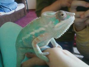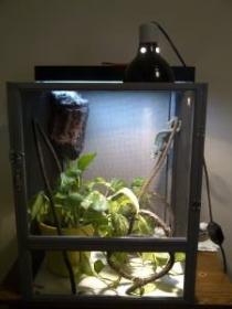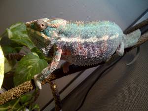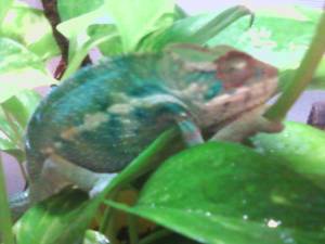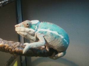 "I have for sale a blue bar ambilobe panther chameleon male hatched feburary 2 hes about 10 months old eating crickets comes with a large screen cage 18*18, real live plant, vitamins, duster, mister, uvb light, basking light, branch's, magnaturals dripper system"