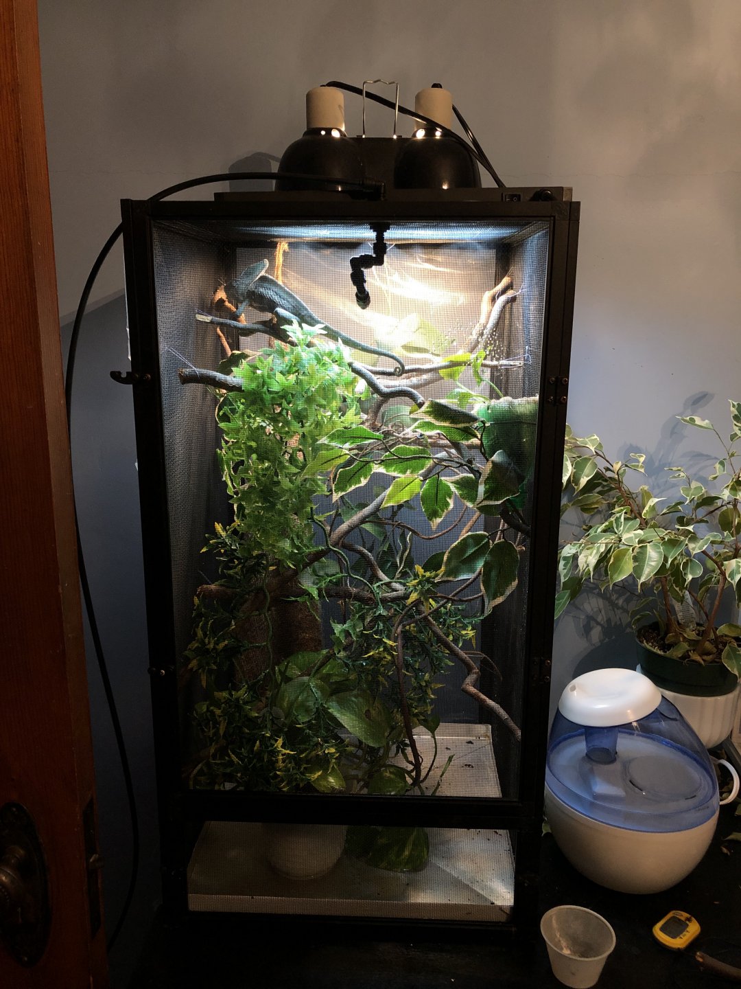 Hello everyone I was just wondering if any of you have tips on how to keep veiled chameleons hydrated? I live in southern Ontario and it is very tough in the winter to keep the humidity up in his cage. I have a humidifier going all the time and I have an automatic mister and I also hand mist as often as I can. I also put him in the shower for 15 minutes every few days. His eyes still seem to be very sunken and he seems dehydrated most of the time. He has an all scene enclosure, I put plastic on two of the sides but his humidity only sits at 50% currently. Can anyone give me any tips on how to get his eyes puffed back up and hydrated ? Thanks !!?