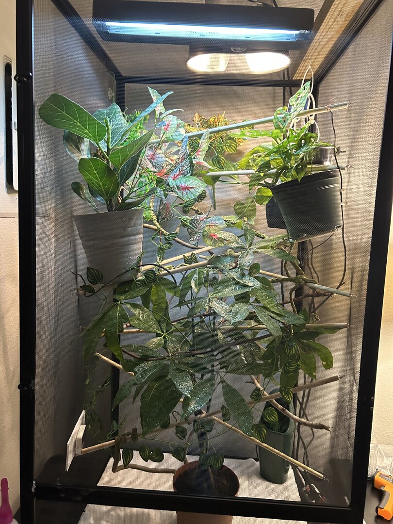 After adding the live plants to my cage, I am finding that they’re starting to droop and yellow/brown. They are potted in organic soil and I water them when the soil feels dry an inch or two down. I do have drainage holes at the bottom of each pot, so i usually water until it starts dripping out the bottom. there’s also drainage holes at the bottom of the enclosure into a drip pan that ive been emptying and cleaning every so often to reduce any chance of bacteria growing in the water. (picture attached is from when i had first set up his enclosure, before adding the drainage to the bottom which is why you see that measly little paper towel at the bottom xD)