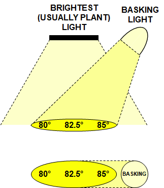 HOWEVER, before running out and buying up your state's inventory of non-LED lightbulbs, I would try mounting the basking light at an angle instead of straight down—angling it will produce a gradient rather than a 'hot spot' and give the chameleon a choice of basking temps. (Temps in the diagram are just examples.)