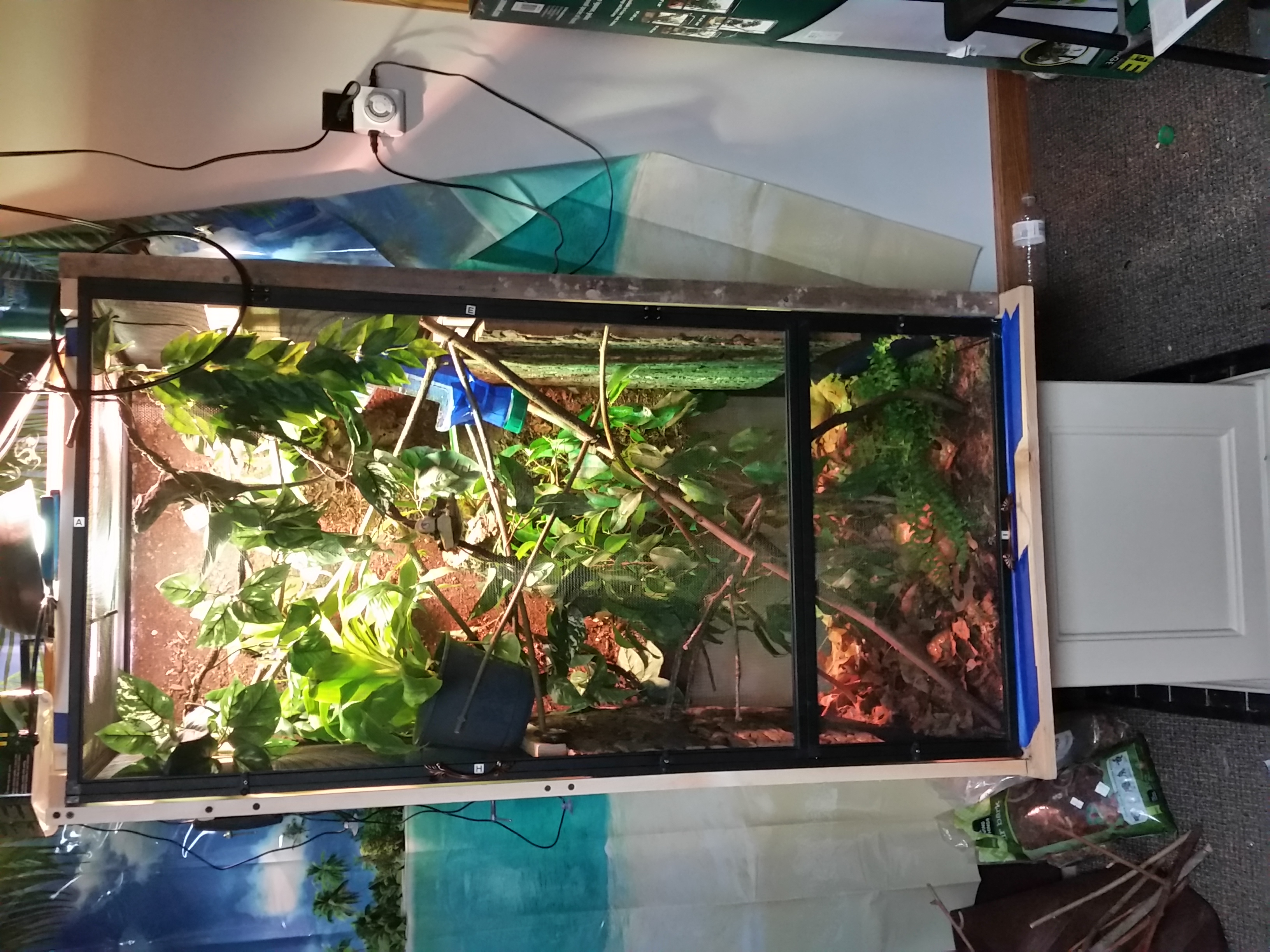 sorry guys i wanted to mention my chameleon species in the original post and forgot but i do have a ficus, pothos, draceana and an ivy in the enclosure, also bioactive substrate, the Biodudes terra firma for when she needs to lay eggs. also it gets pretty dry during the day as im at work most of the daylight time, during lunch break i run home feed her look things over and turn the dripper on to a slowish steady drip. the little dripper brand which i fill about half way I think it's about a quart of water that runs out. and give a quick misting to the cage. since the humidity has come up I dont always mist it down anymore. I added a pic from a month ago. I've enclosed about 2/3 with shower curtain just draped up against the sides. today I removed the extra basking light as it has gotten alot warmer here the last few days.