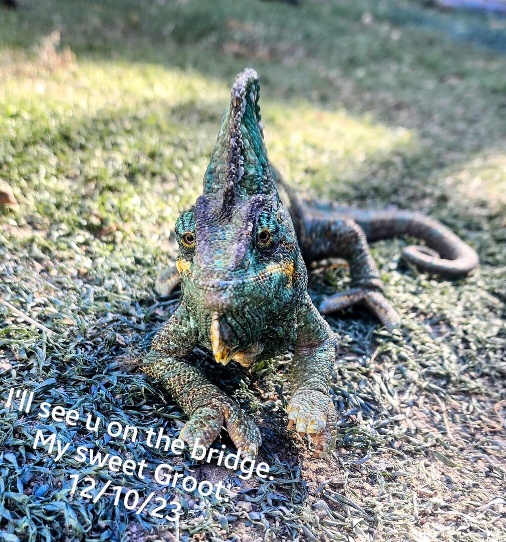 Tonight I made that impossible choice to focus on what was best for my 1st cham. My heart, Groot. I'm left with huge hole in my heart n swollen bloodshot eyes. And some amazing and priceless memories over the past almost 6 years. I loved him so much, he had the sweetest spirit and a kindness thats unheard of, especially from a veiled. I will miss him so painfully much. He never bit or even flared/fired up at me. Just when he saw another cham. He lived in a huge open range w outside patio. Spoiled and I loved everyday w him. I feel so gutted. And hurt that my husband keeps saying: he was just a reptile, why are you so upset. I honestly wanna punch his face in, so I left, lol. Groot wasn't perfect, had some mbd, but to me, simply perfection. I'll see u on the bridge. Miss you already my boy.