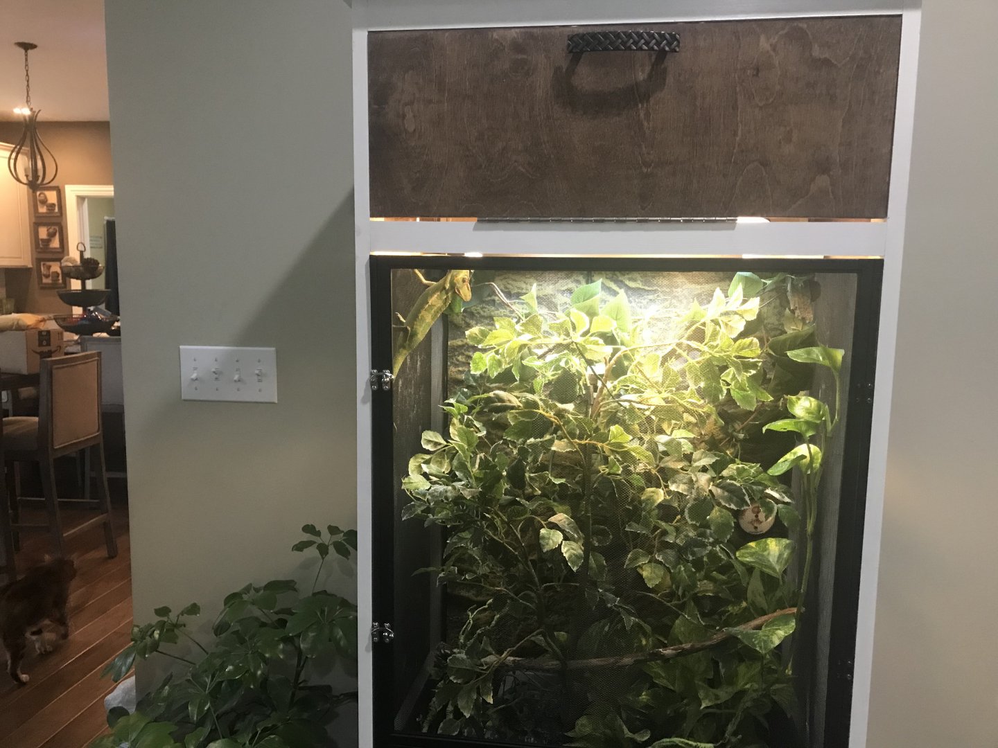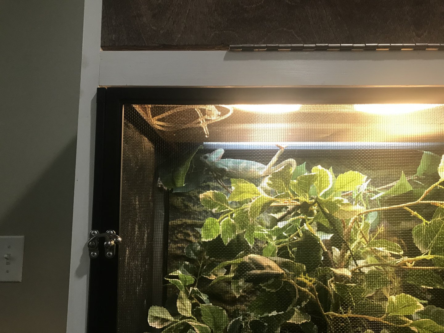 - Plants - just pothos on the bottom and right side of cage. Fake ficus type bush provides all climbable surfaces, plus one magnaturals bridge vine and a branch.