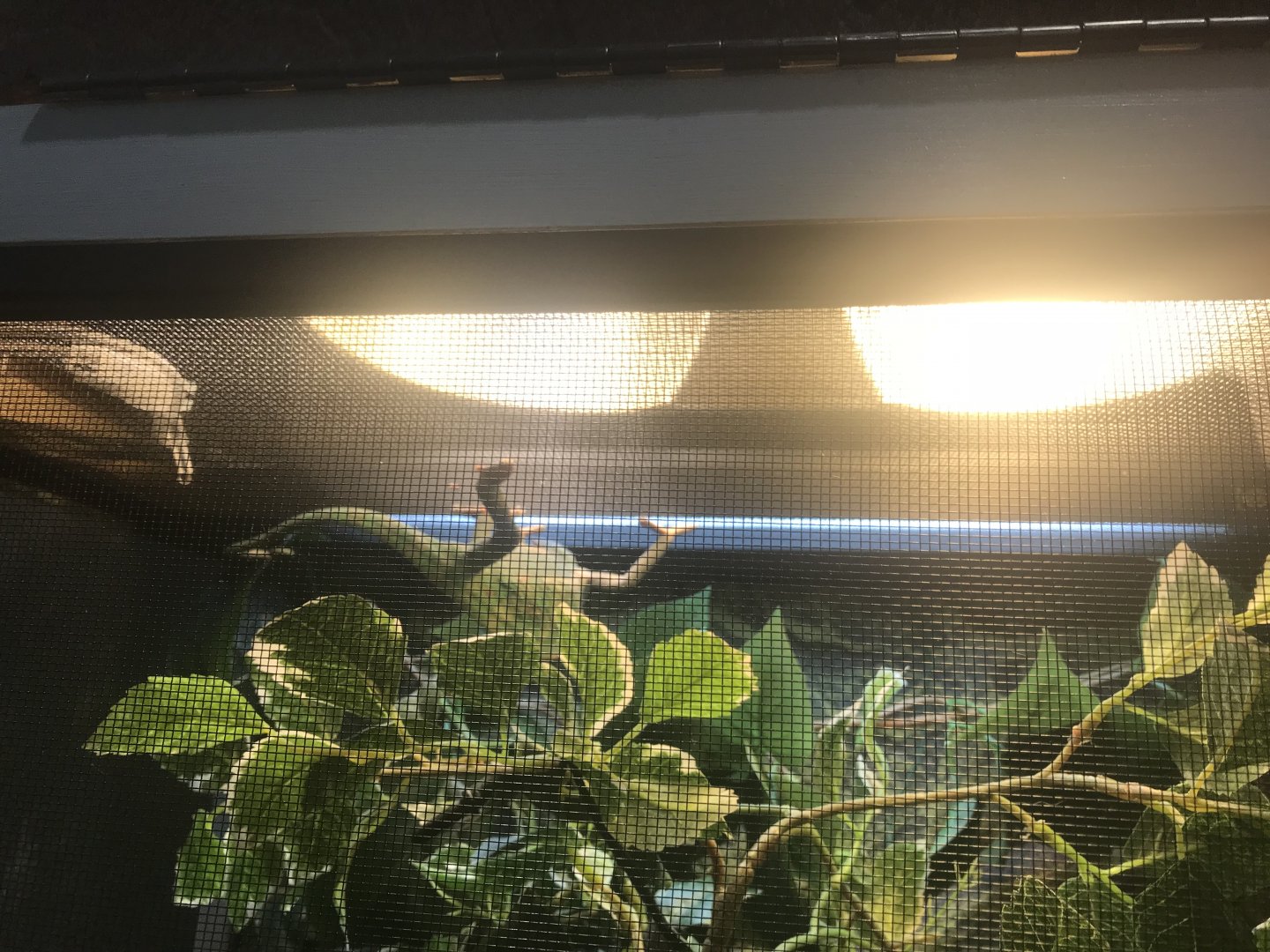 Hi all. I'm concerned about Norman's sudden interest in climbing about his cage sides and top. He's been in my care since August and has never been seen to do that except rare instances when he couldn't find branches to where he wanted to go, but that is not a problem any longer in his habitat. He can reach anywhere by branch, but every day for the last 3 days I've watched him reach for the sides of his screen in the same front left corner, then proceed up to the top (about 4 inches), then hang from the top under the heat lamp area or sometimes under the sun lamp. He seems to come down fairly fast, but that may be due to the cats' going bonkers that he is so exposed and actively moving, causing said cat to pounce at the cage, although Norman generally doesn't bother to come down until I've stood at his cage side peering at him in befuddlement as to why he's making himself an easy target for what is usually just a curious cat.