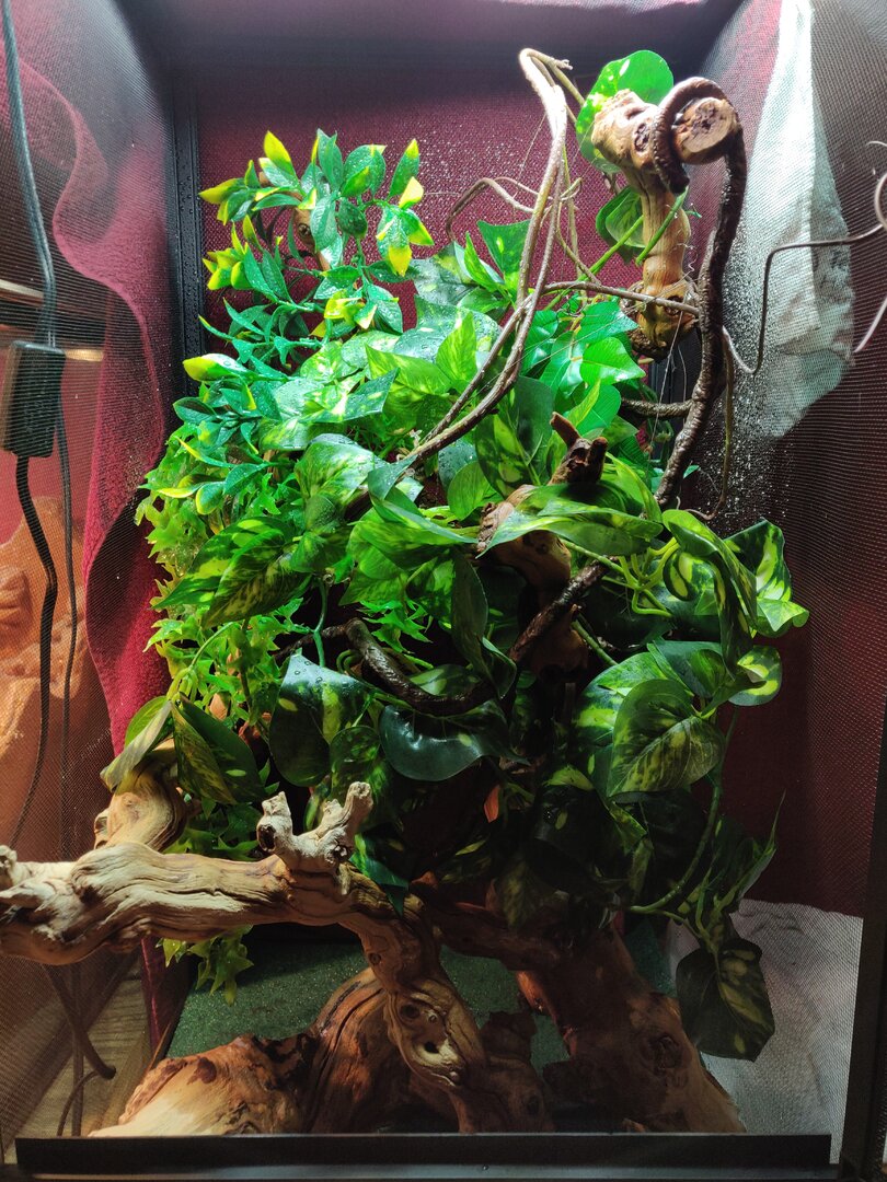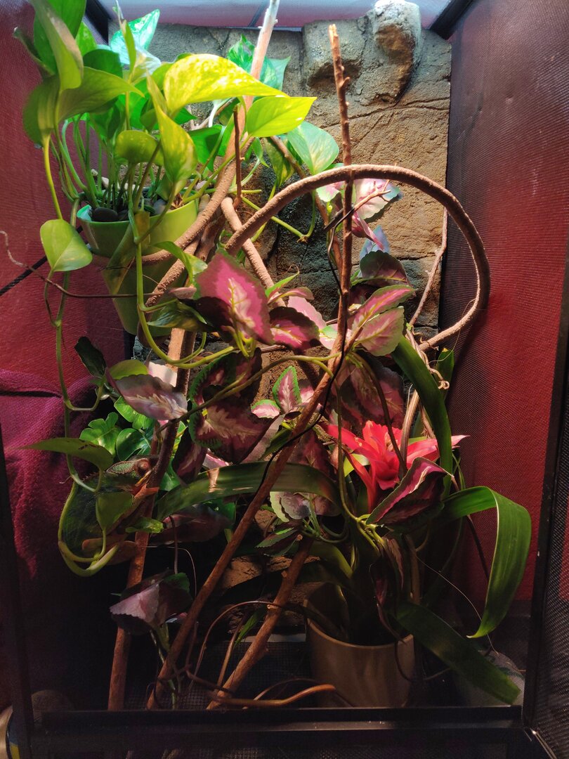 Ohhh okay that makes sense for sure! I actually have some mossy branches that I ordered yesterday so that should help out with that issue! Do you think I should add anymore plants or anything too? I have these fake vines I could add if you guys think he needs anymore hiding spaces too? I guess I don't know when is too much when it comes to decorating his cage haha.
