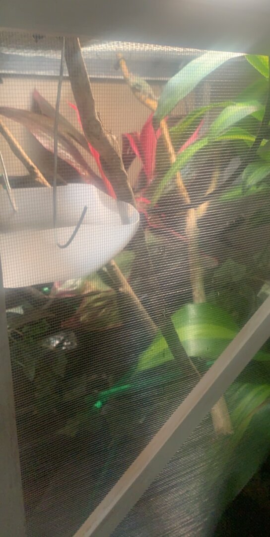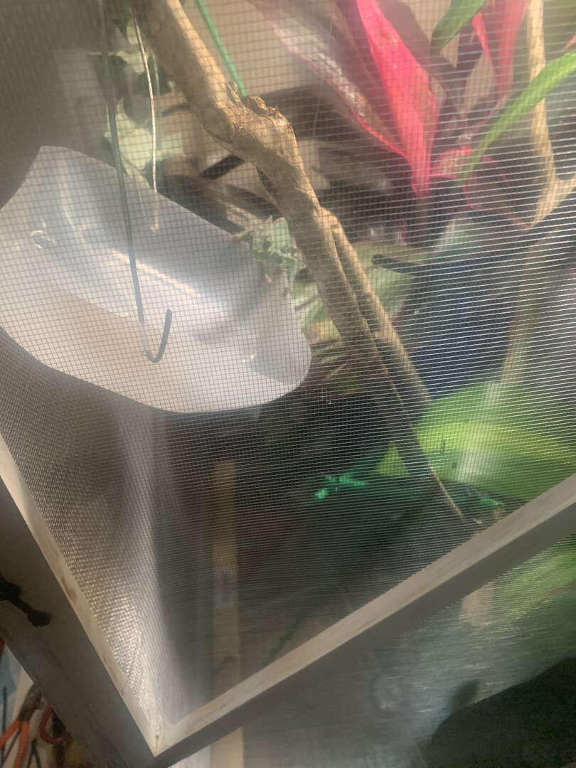 So I added sticks last night two hours before lights went out he slept on my mister hose. This mourning he was still sleepy after lights went out his lights have been on for 15 mins now I added and additional feeder so hopefully he’ll eat more today. He’s got the white spots on his head so I believe he’s shedding, when I came in this morning after the lights he was puffed up with his mouth open and was chilling he is already using the sticks I added as I was typing he made it over to eat , he seems way more active rn I’ll keep you posted. I should add more sticks right I plan on it today ?( he ate all six in the new feeder I added 8 crickets and 4 mill worms ) he’s rubbing his head against his stick ?