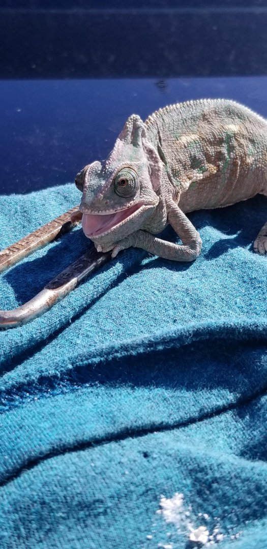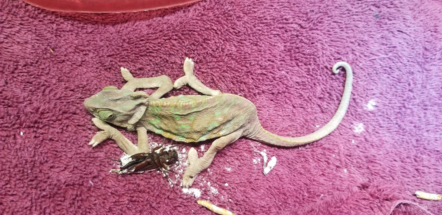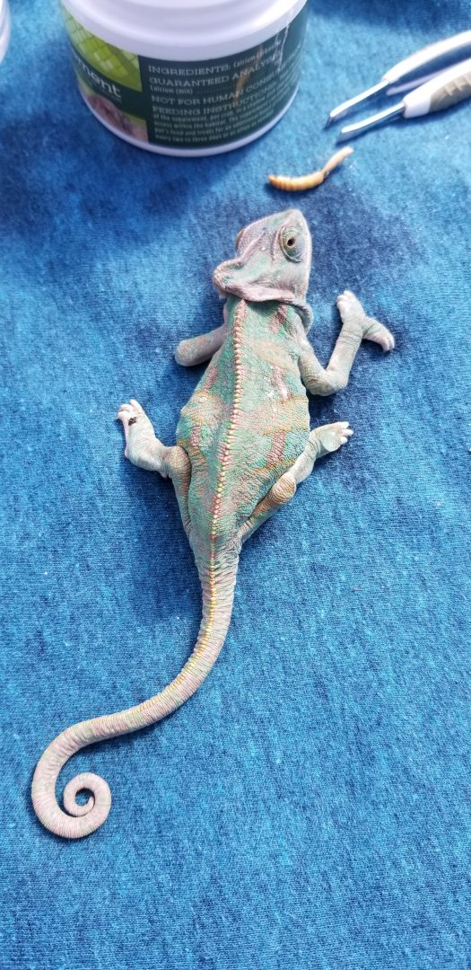 I posted 2 days ago about a baby veiled chameleon I rescued from a bad home. I'm going to add some pictures and I need your opinions. I took her to a vet who had no knowledge of reptiles and I'm afraid in my area they were my only option. It's very obvious she has MBD. I've taken all climbing items out of her enclosure. She walks around a little but won't eat or drink (I still have a dripper going on leaves). She has changed to darker colors as well which is worrisome. So, after looking at the pics, is there any hope? Should I have her put down? Yes, this is my first chameleon I got simply because she was in a bad home. I know I'm not doing things perfectly (there's way too much calcium on that cricket and it needs to be cut into smaller pieces ect.)