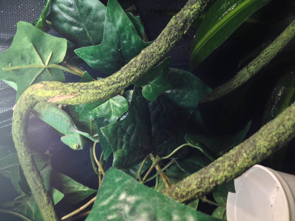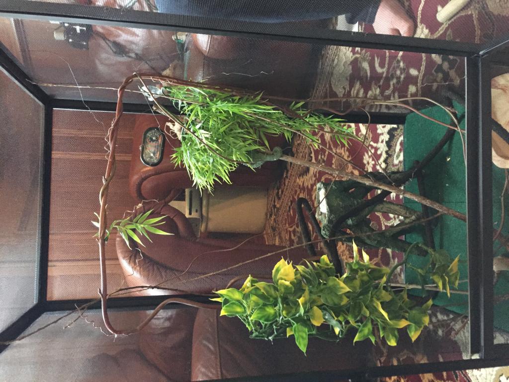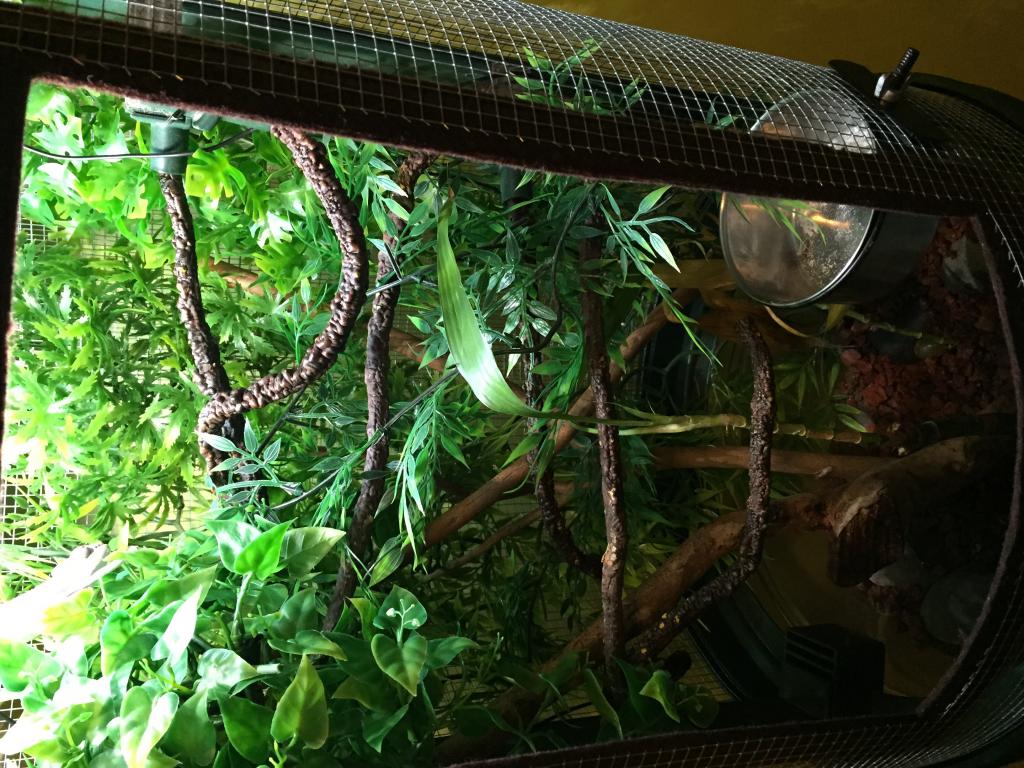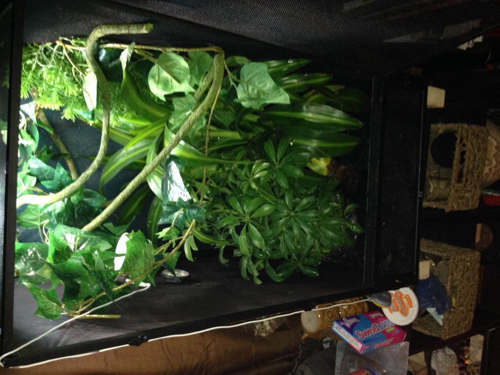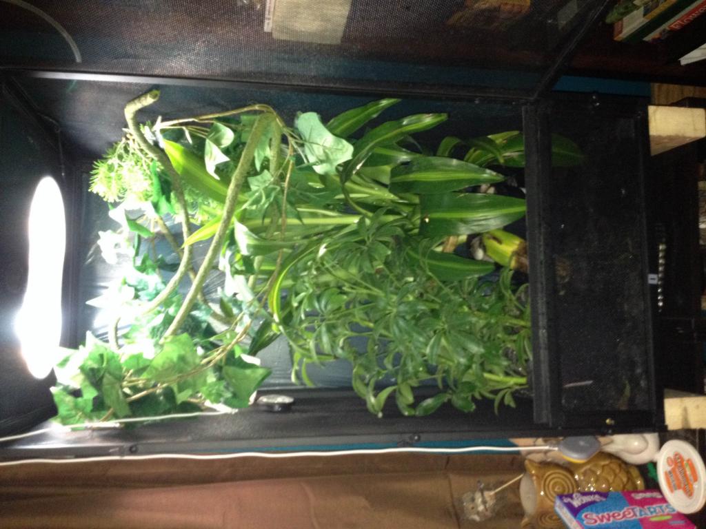 (In the picture his mister and light are not on... I had to move the cage to tie stuff up with fishing line)