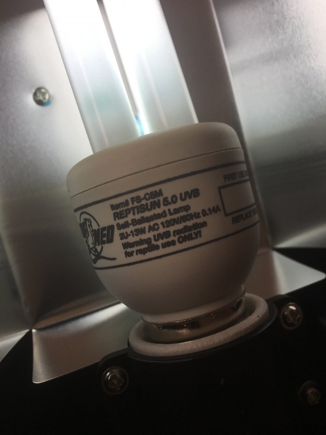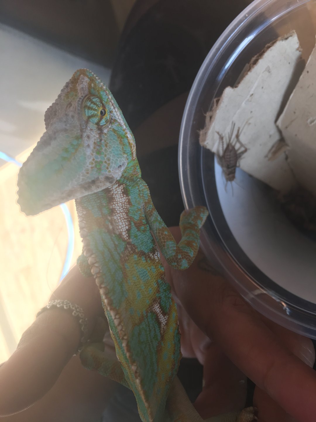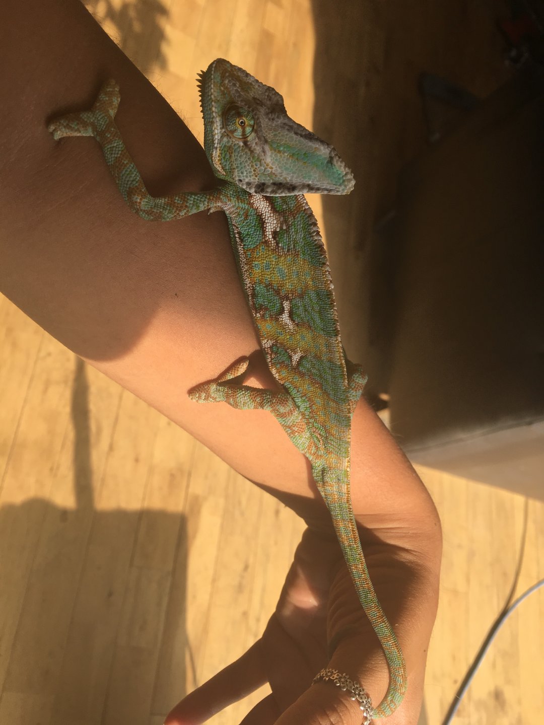 hey everyone I’m new to this page. I have a veiled chameleon. I had him in a small glass cage (starter one). I have had dyno since may and when I got him he fit on my finger( unsure of age). Since he has grown I decided he needed something much nicer. I purchased a new zoomed mesh 18x30 . Used the same light as it was bigger then my small cage so would stick out anyways. He been in the new cage for over 2 weeks and he seems so much more moody. I use to put him in a indoor tree and he would change colour (annoyed) when I got him out of the cage(small cage) but since I got the bigger one he puffs and seems extremely scared of my hands. I know they do not like to be handled well some but I’m wondering if the lighting is ok since the cage is so long and that could be why he so grumpy. I will post picture of the cage and lights I have. He also stays on the top of the cage for the most part unless I throw crickets in.