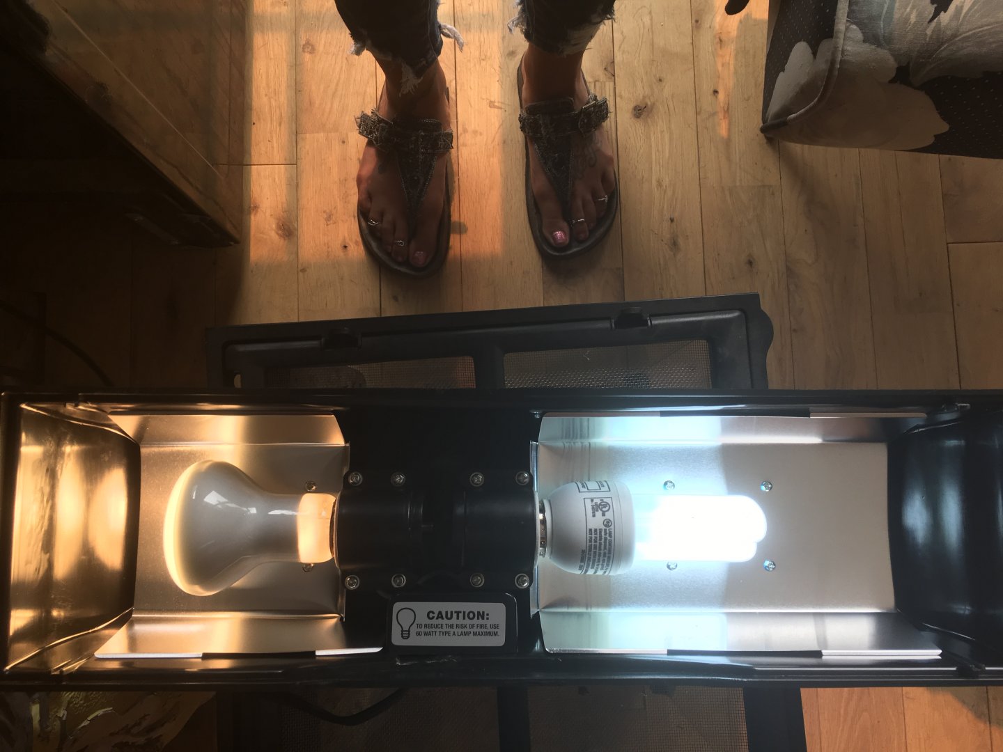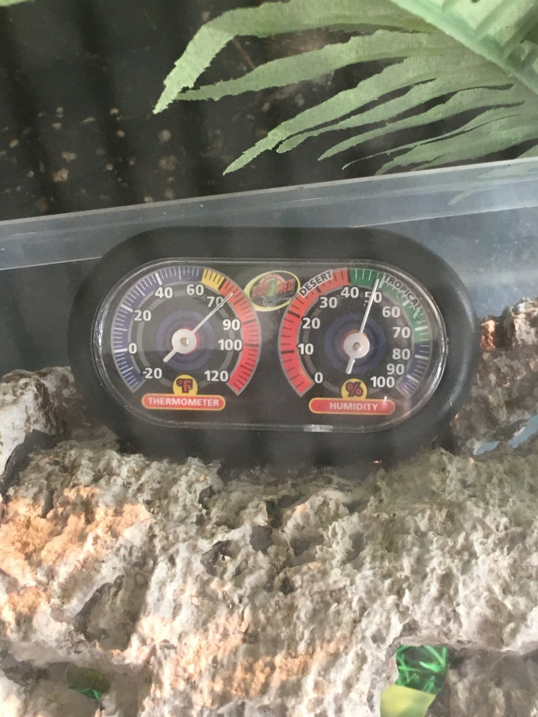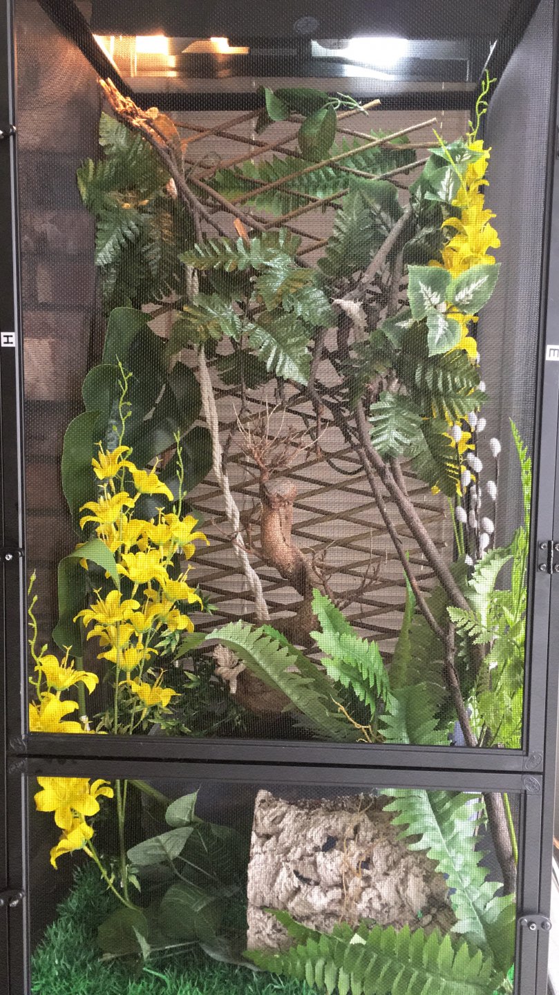 High. Search:basic husbandry and also supplementation in the search bar and read thoroughly. I’m only trying to be helpful. I also see silk flowers and a fake grass substrate in the enclosure (flowers could be ingested and would be disastrous) fake grass is a breeding ground for bad bacteria. Search Cham safe plants in search bar and get at least a couple of those in there for humidity and some vieleds (lots) munch on them(golden pothos do very well) and are everywhere...I see lots of perches(y) and some hiding places(y) ...but I’d add some more horizontal perches too...good luck to you , it’s sounds like way more than it is, you’ve got a good start:)
