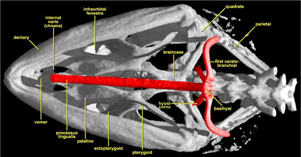 There's a bone called the hyoid bone that is stored in the hole at the front of the mouth. The tongue folds over it like when you shove your sleeve up your arm...then it's all stores in the mouth.