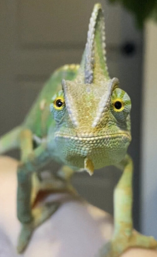 … and maybe I do have something off! That’s why I’m here after all. But… I can tell you his colors are great, I know when he’s calm vs stressed and if ever shows signs of stress (like getting slightly darker - I never would never let it get to anything worse like starting to shut down down due to stress…closing his eyes etc.) we go immediately to his room and he has options. His tree outside his enclosure which he can climb around on (supervised), going back inside his cage, or chilling with me some more, but IN HIS room… whatever he wants to do. He’s just a super sweet, loving, little guy. Idk how old he is exactly, but I figure it plays a pretty big part of his trusting attitude. (And I actually have another theory going on friendly chams, but as broader topic though - maybe another time.)