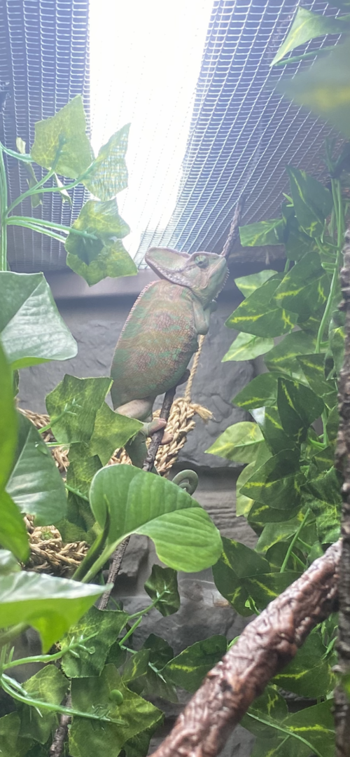 Me and my bf have a 4 month old veiled chameleon and we have been worrying about him for the past few days because we had moved him into a new taller enclosure about 2 days ago and he hasnt been eating properly sense I think it could be stress from moving homes but i just want to make sure 100% hes okay but we feed him a variety of inscets such as medium- large crickets, dubias, superworms, hornworms, and mealworms were thinking of maybe getting some waxworms and maybe flies for him bc weve seen him shoot at fruit flies and stuff and think that could be fun for him to hunt and we also try to dust every meal some meals we forget but we dust with just calcium and on fridays calcium with d3 but everything about him has been okay except for eating we think he might have a shed soon and were reading about loss of appetite before shed but were just really not sure in his new cage it has the same lights and misting setup we usually have it mist every 3 hours for 45-60 seconds but sometimes well switch it to every one hour if we feel like its really dry in our room and we also have a hand mister and well use that too to give him a really good mist before bed and in the morning and in his enclosure he has plenty of spots to climb and hide and bask under the light and his heat lamp we like to set the heat lamp around 80 degrees sometimes 75 if we feel like its extra hot or will turn it up 85 if its kinda cold in his cage he also has many plants like a golden pathos a braided hibiscus tree and a honeysuckle bush and for the past few days hes been eating leaves off the golden pathos and the bush and the flowers off the hibiscus also in his cage he has fake vines that he climbs up and many of the benda branch branches and hes like moving around and like looking around there and i hope hes getting used to the cage and will hopefully eat soon from maybe just being stressed but hes in a way better home than before this one holds humidity way better than our last one but our last one was just a first try cage it was still very nice but the one nows way better ima add some pics of him and his new cage and the last pic is his old cage thank you