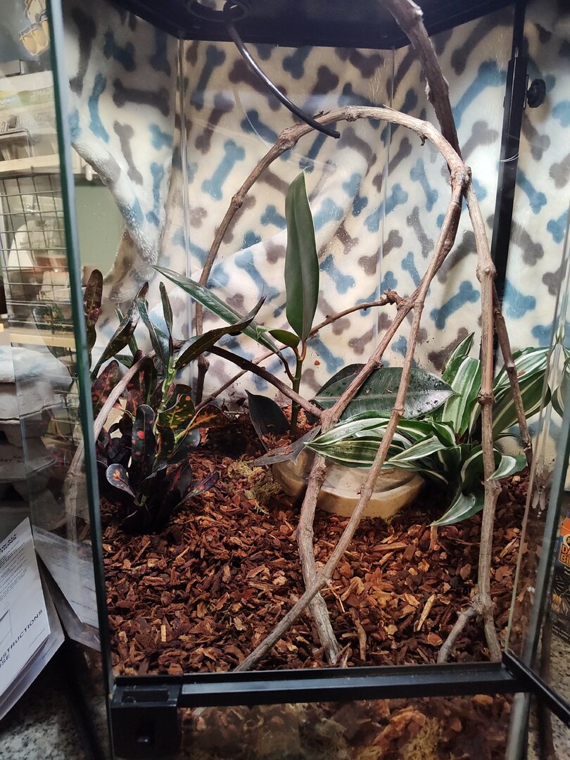We have him in a Thrive 19.1 L x 16.6 W x 22.4 H glass hexagonal terrarium. We are using ZooMed 60 watt daylight bulb and a mini 5.0 reptisun in a dual fixture. He will get an upgrade but I had read somewhere to start them in a smaller one and move up. We have a rubber plant, a croton and a dracaena planted in the terrarium. Substrate is a mixture of coco coir and reptibark. We have grape vines for him to crawl on
