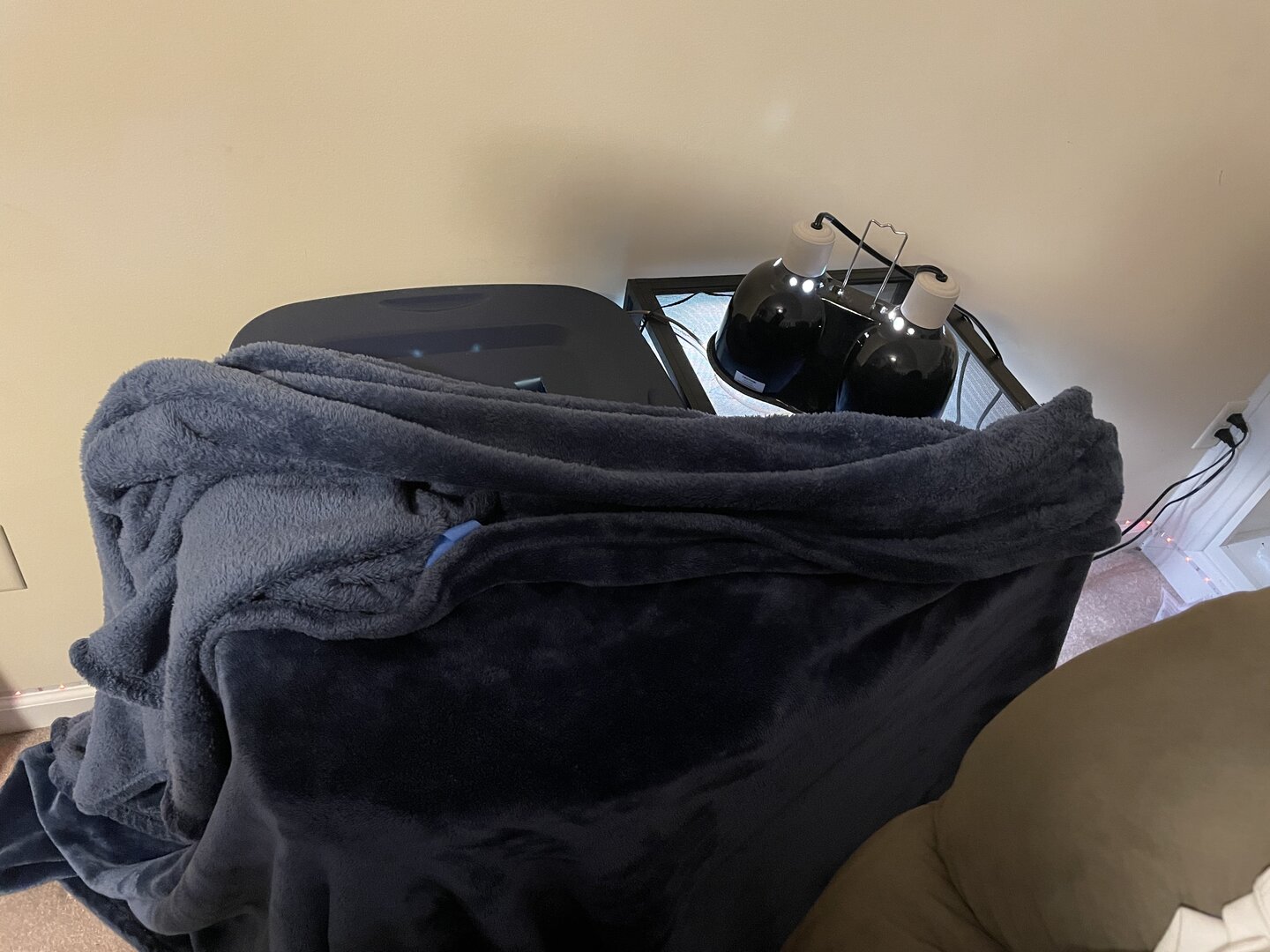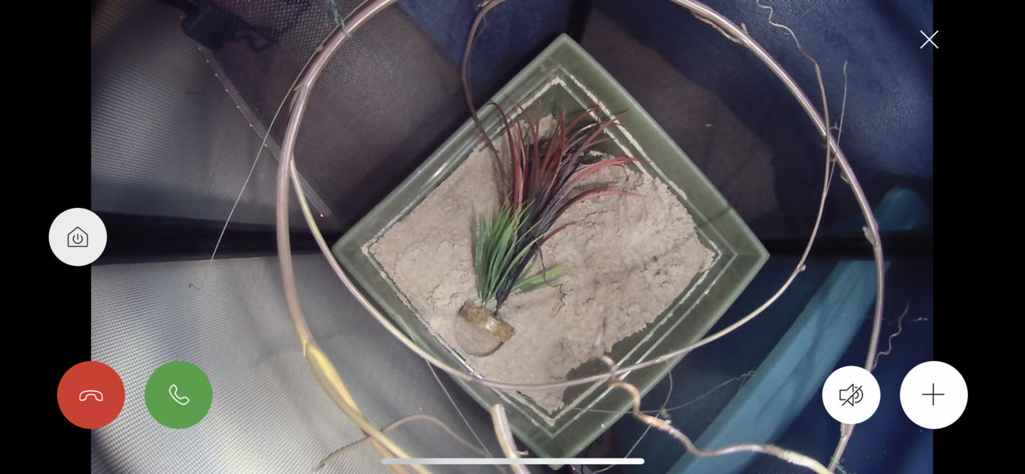 One of the photos is from my ring camera on top of the cage so I can keep an eye on her. She’s covered up on all sides except one but that just faces the wall so it’s not an issue. I had that little fake plant in the sand to give her a little bit of cover, however she ended up trying to climb on it and it fell over but it worked out because she decided to make her tunnel right under that. You can’t see her that well but she’s the dark blob under the purple part of the plant.
