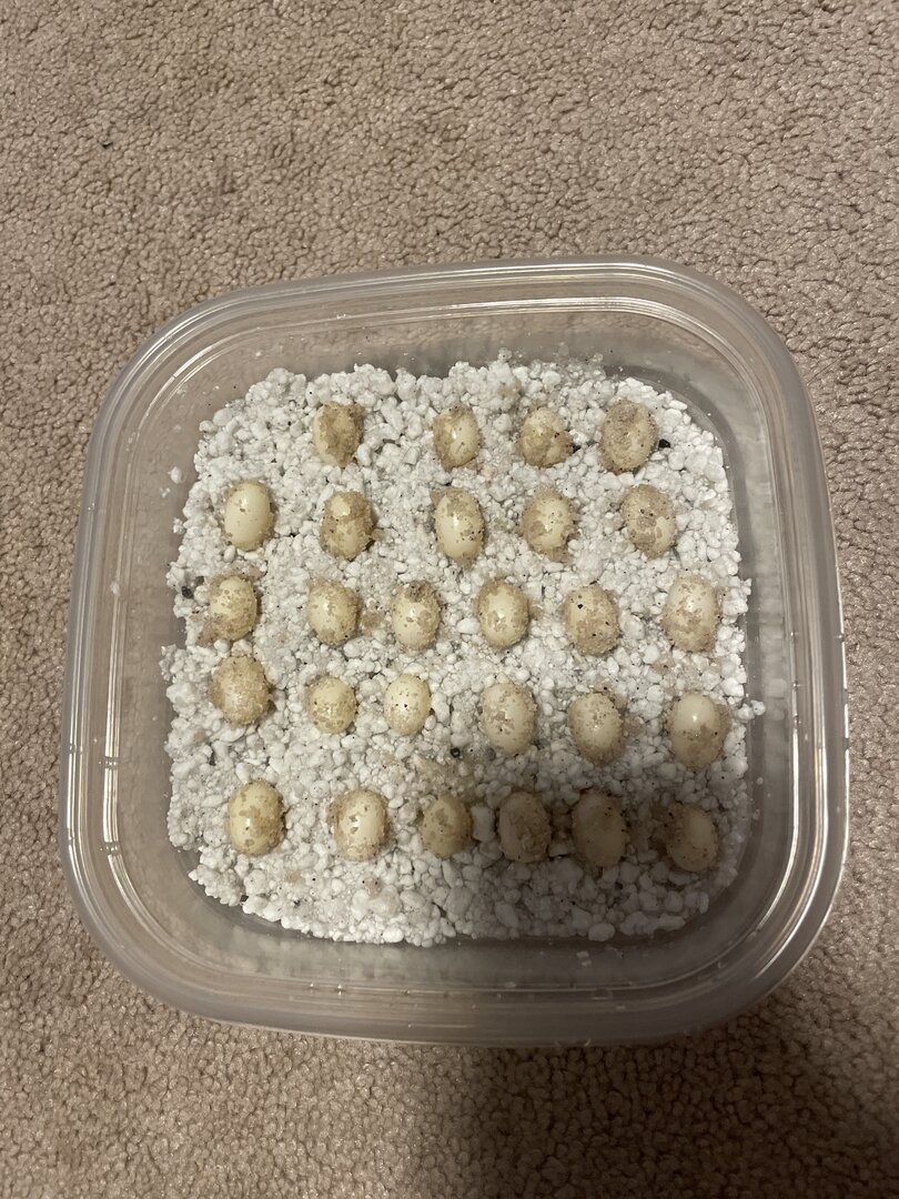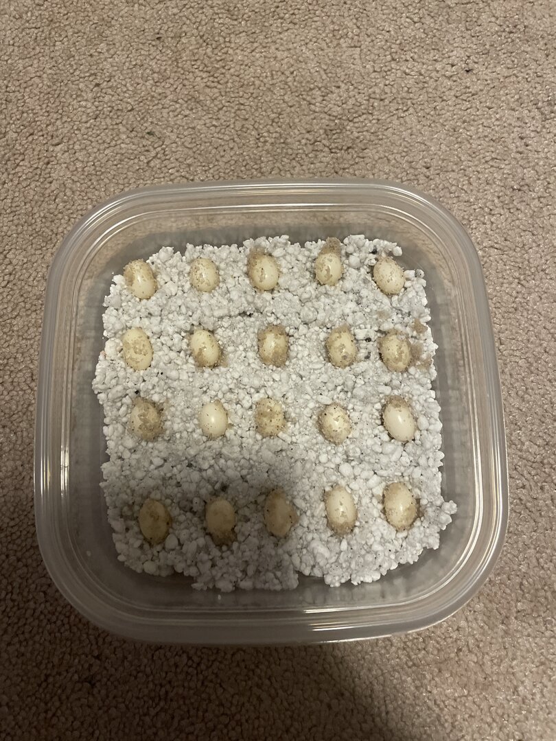 47 Eggs!!! So just a few questions now, I moistened up the hatchrite so it’s damp but not soaking wet. Do I need to poke holes in the lid? Do I need to wash the sand off? Are the eggs too close together?
