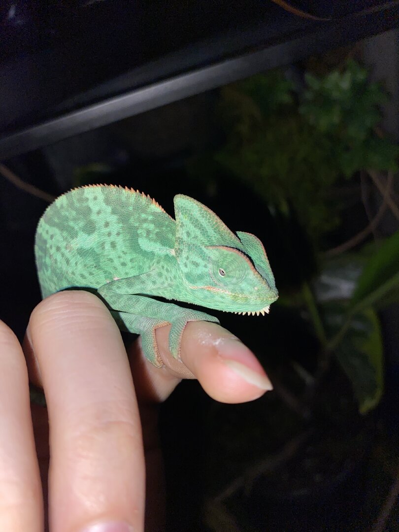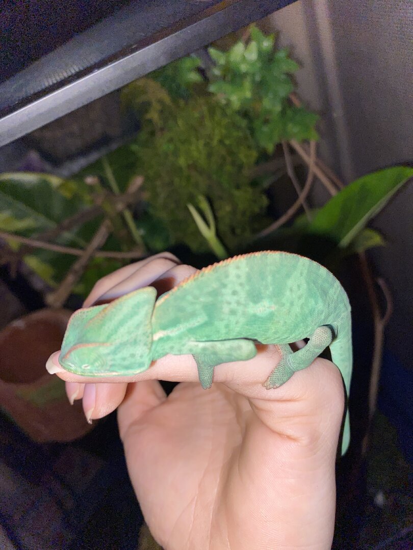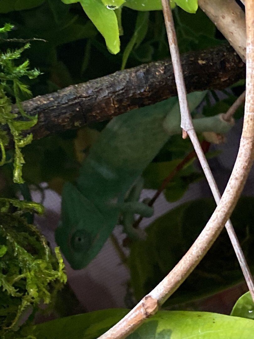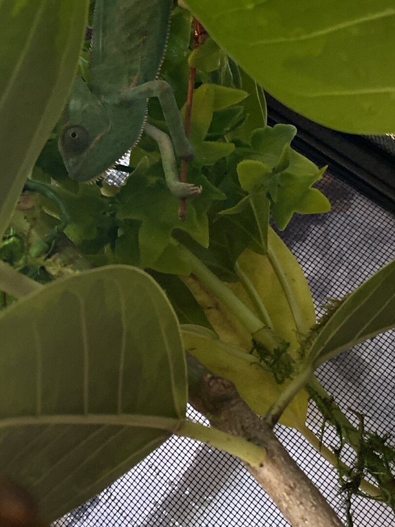 The issue is recently I have been catching her sleeping during the daytime, small naps but for good time. She never used to sleep in the enclosure during daylight hours, and with my experience it seems off. Both eyes are functional while she is awake and she is alert of her surroundings if noise or movement is noticed from the reptile room. She can climb when she wants to and has an iron grip. She does eat but not her normal appetite. Originally she ate 4 large crickets daily spread between two feeds of 2 large crickets. Recently she will eat 2 large crickets daily but yesterday she ate none at all today she ate 2 and would not go for a second feed. I’ve not seen a change in body weight, no sunken eyes, no signs to indicate respiratory infection, no signs of body/skin damage. Her daily routines have switched from the daily basking for majority of the day to basking for maybe 6 hrs a day and naps in between behind vegetation with eyes closed which is abnormal usually she basks, explores, basks, explores the entirety of the day, that’s her pattern she’s kept for the 2 months I’ve had her. I will attach photos of her in the comments. Anyone have any ideas of what this could be. I am setting an appointment just to be safe for her to be checked tomorrow I do not have a 24/7 reptile vet in my area and I know some things with reptiles can be life or death very shortly, in the meantime does anyone have any suggestions or ideas of what she could be dealing with I could just be an overly worried Cham owner but I know the delicacy of chameleons specifically and when something isn’t like usual it usually isn’t good.
