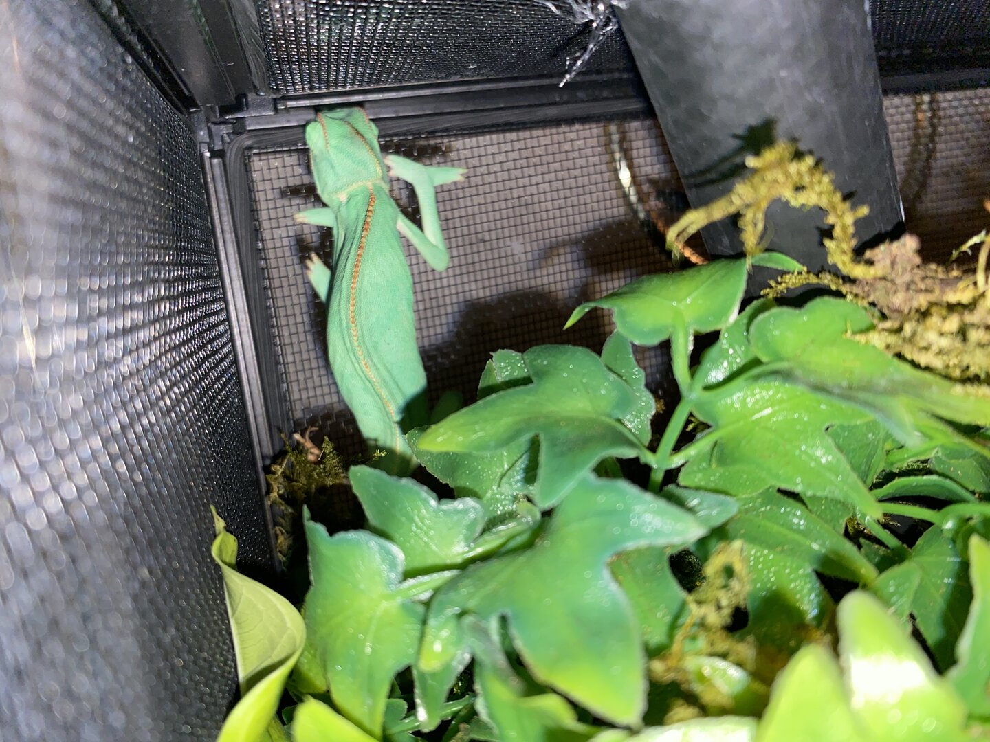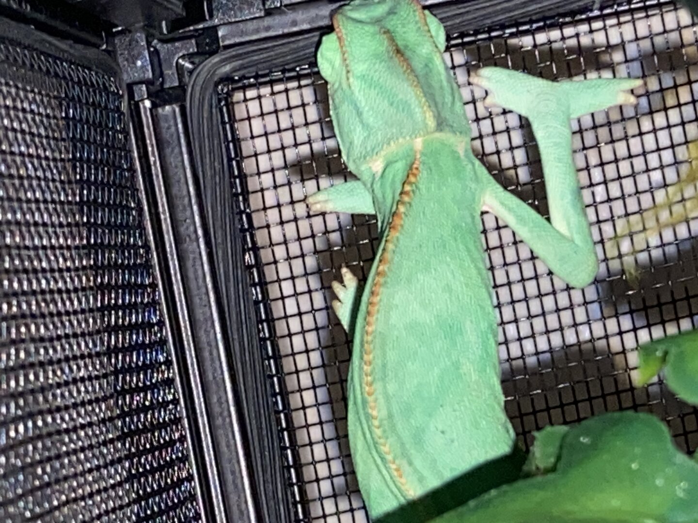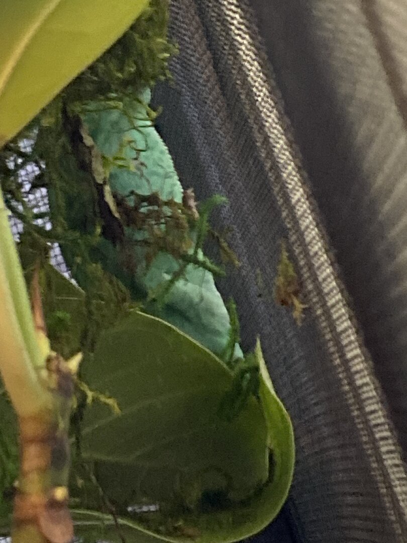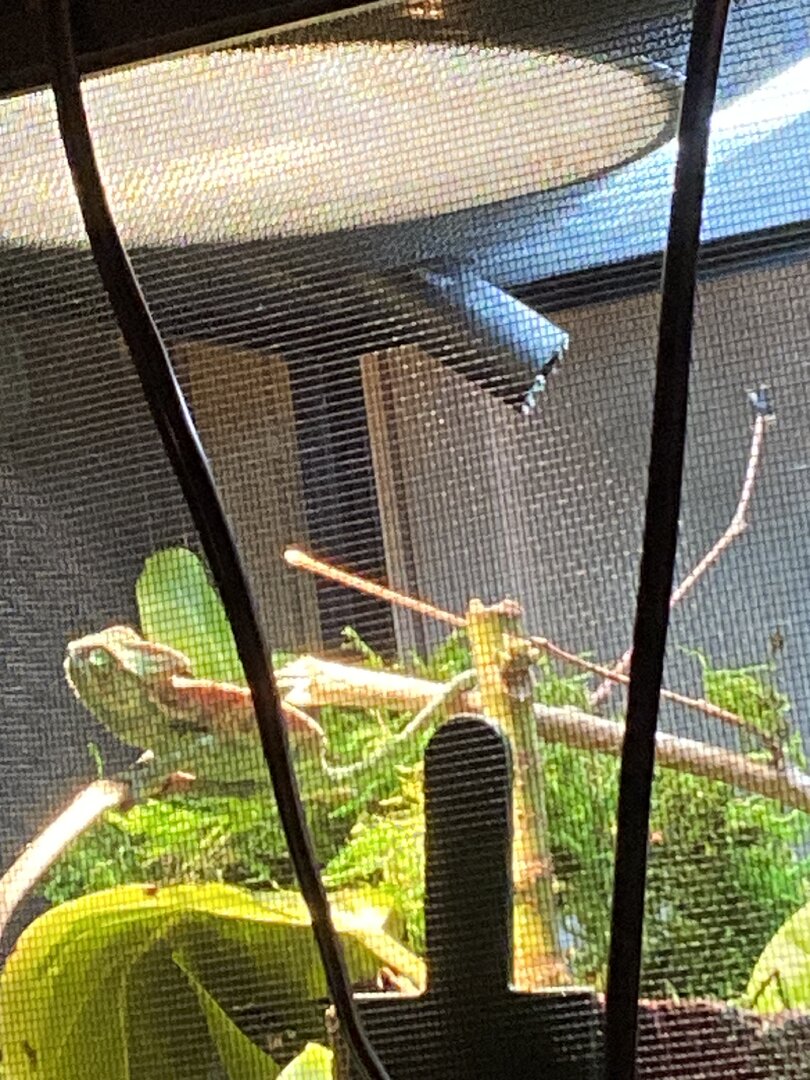 The issue is recently I have been catching her sleeping during the daytime, small naps but for good time. She never used to sleep in the enclosure during daylight hours, and with my experience it seems off. Both eyes are functional while she is awake and she is alert of her surroundings if noise or movement is noticed from the reptile room. She can climb when she wants to and has an iron grip. She does eat but not her normal appetite. Originally she ate 4 large crickets daily spread between two feeds of 2 large crickets. Recently she will eat 2 large crickets daily but yesterday she ate none at all today she ate 2 and would not go for a second feed. I’ve not seen a change in body weight, no sunken eyes, no signs to indicate respiratory infection, no signs of body/skin damage. Her daily routines have switched from the daily basking for majority of the day to basking for maybe 6 hrs a day and naps in between behind vegetation with eyes closed which is abnormal usually she basks, explores, basks, explores the entirety of the day, that’s her pattern she’s kept for the 2 months I’ve had her. I will attach photos of her in the comments. Anyone have any ideas of what this could be. I am setting an appointment just to be safe for her to be checked tomorrow I do not have a 24/7 reptile vet in my area and I know some things with reptiles can be life or death very shortly, in the meantime does anyone have any suggestions or ideas of what she could be dealing with I could just be an overly worried Cham owner but I know the delicacy of chameleons specifically and when something isn’t like usual it usually isn’t good.
