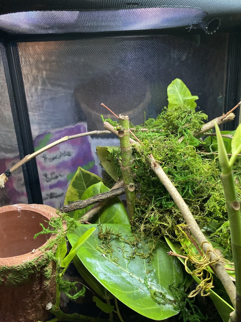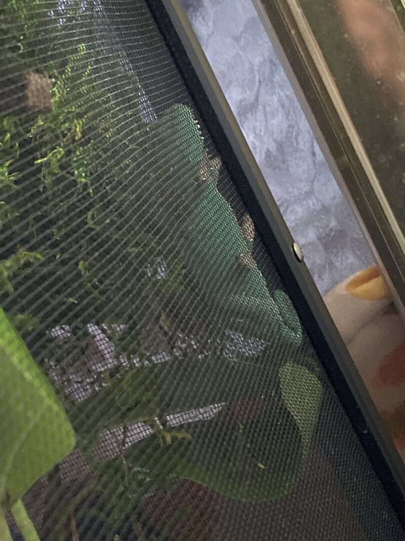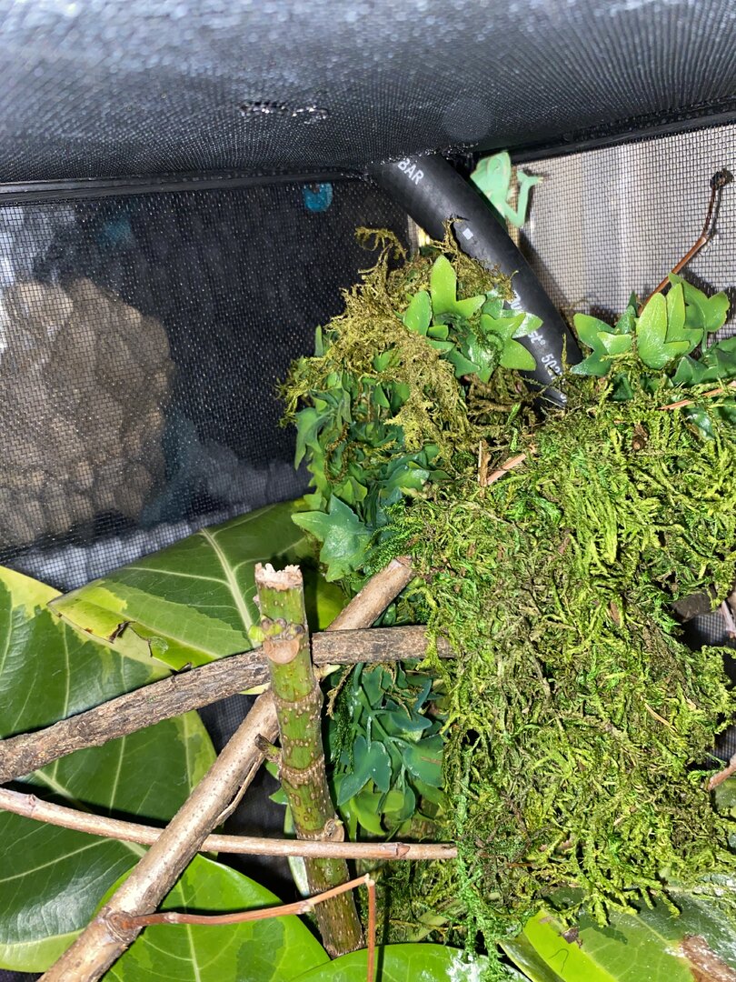 Also it is very dry where I am at right now that is why the tropical moss was implemented to retain the humidity, it is temporary for the winter and will be removed when humidity isn’t struck out of the cage by the dry winter. I don’t cover any sides of my cage for the most perfect ventilation and to recreate the most natural humidity I use the moss sprayed then fog the center mass of her cage and the moss for 5hrs I just spray the moss at the bottom and the few spots I have around the top to hold the humidity while their is full ventilation of the cage.