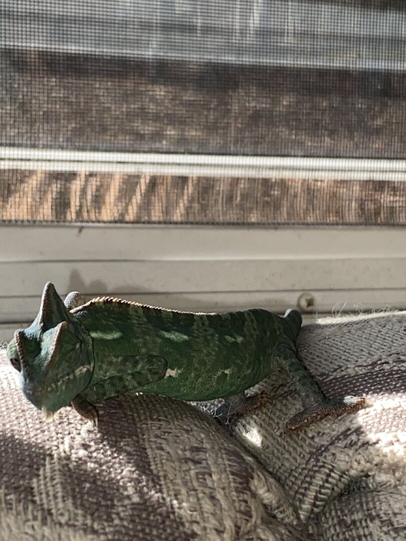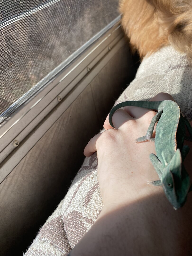 We made it to our appointment and the info is good. Iris is not iris. She is not a she, he is a he. I paid $110 the vet said he showed no signs of any illness at all, we spoke about his diet and where I purchased him from. We came across me remembering when I purchased him the representative at petsmart said he was fed only 2 small crickets daily and the gutload on those feeders is very bad. The vet said he did suffer from some malnutrition but he said if the pet store was only feeding her 2 small crickets daily he was never able to control his diet. He asked me how he fed when I got him and I said he ate much more the first 2-3 weeks he was fed all the small crickets he could eat in a 15 minute period twice a day and he would eat nearly 20-30 of them per feed. The vet said when a chameleon is sick from malnutrition like that it has to heal, and now since he gets to eat a diet he can regulate he won’t choose to eat every time and he is healing from the malnutrition, he said chameleons sometimes overeat after instances of malnutrion and it is common for a healing chameleon to rest during recovery after regulating their diet. So the pet store was feeding her incorrectly 2 small crickets a day for a chameleon that is 2 months old at the least he was very skinny I showed old pictures it is sad that pet stores are less informed than us on how to feed a reptile. We also spoke about the cage she was kept it was a 1x1 foot cage and that some pet stores don’t care about correct husbandry they care about getting the chameleon sold and sometimes they stay there for long periods of time.