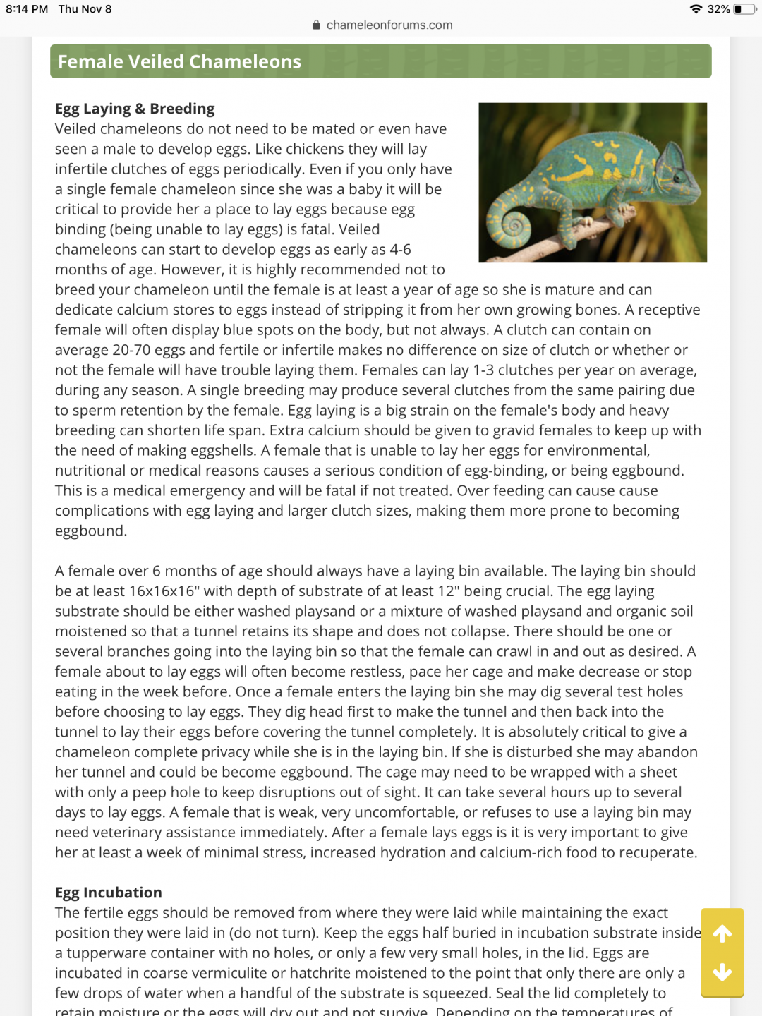 So this is my first veiled chameleon. I got her when she was just a baby. (Not sure of her actual age, the pet store wasn’t sure either) And I did as much reading as I could before I got her in July. And then in September I noticed her acting strange. And first she turned black and I got super scared and asked the guy At the pet store first. And he instantly told me she was dying. I then set an appt at the vet I could get in soonest which even then wasn’t until the next day at noon. So that night she seemed fine. The next morning (around 5am) I noticed she was just still on the bottom of the cage. She wouldn’t move and didn’t wake up until I actually moved her, Which terrified me. I did more research on female chameleons and read she could be getting ready to lay eggs so I hurried and bought vermiculite and filled one of my bins with it and set her in there. She seemed so mad about it and pretty much ran out of it. I took her to the vet and all they told me was she has eggs for sure and not to worry. I then had it set up so when I was here I left her cage open so she could go in the bin whenever she pleased and she did not seem interested in it at all. And I thought it was just because it wasn’t in her own surroundings or anything’s. I then filled a smaller container (like a waste basket) with the vermiculite and put it in her cage and she was just mad the entire time it was in there. I then bout a real plant (ficus about medium height) and set all of that stuff up in a new bigger cage for her and everything. She still seems so disinterested in it. In October I noticed she had stopped eating and I noticed she had a runny nose which I read wasn’t good at all for her so again I scheduled to get into the vet again right away. (Different one this time because this one could get her in sooner) this one just checked her out and left me with the same answer as the other. She’s got eggs. And lots of them. But not to worry. She appears healthy as can be bones look healthy just dust more calcium on her crickets. But I feel like I should worry with her runny nose (she no longer has one now).