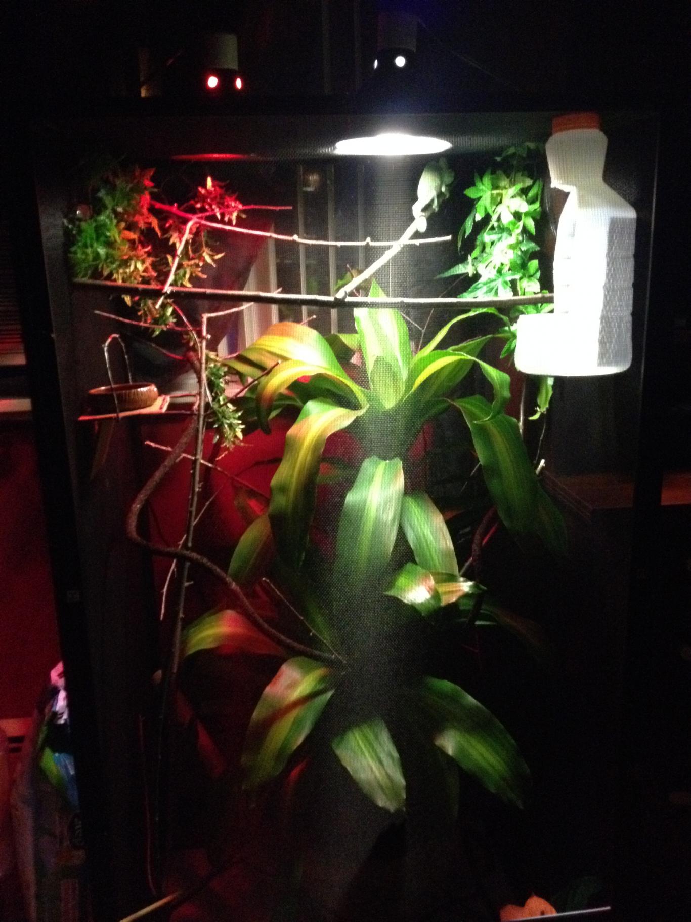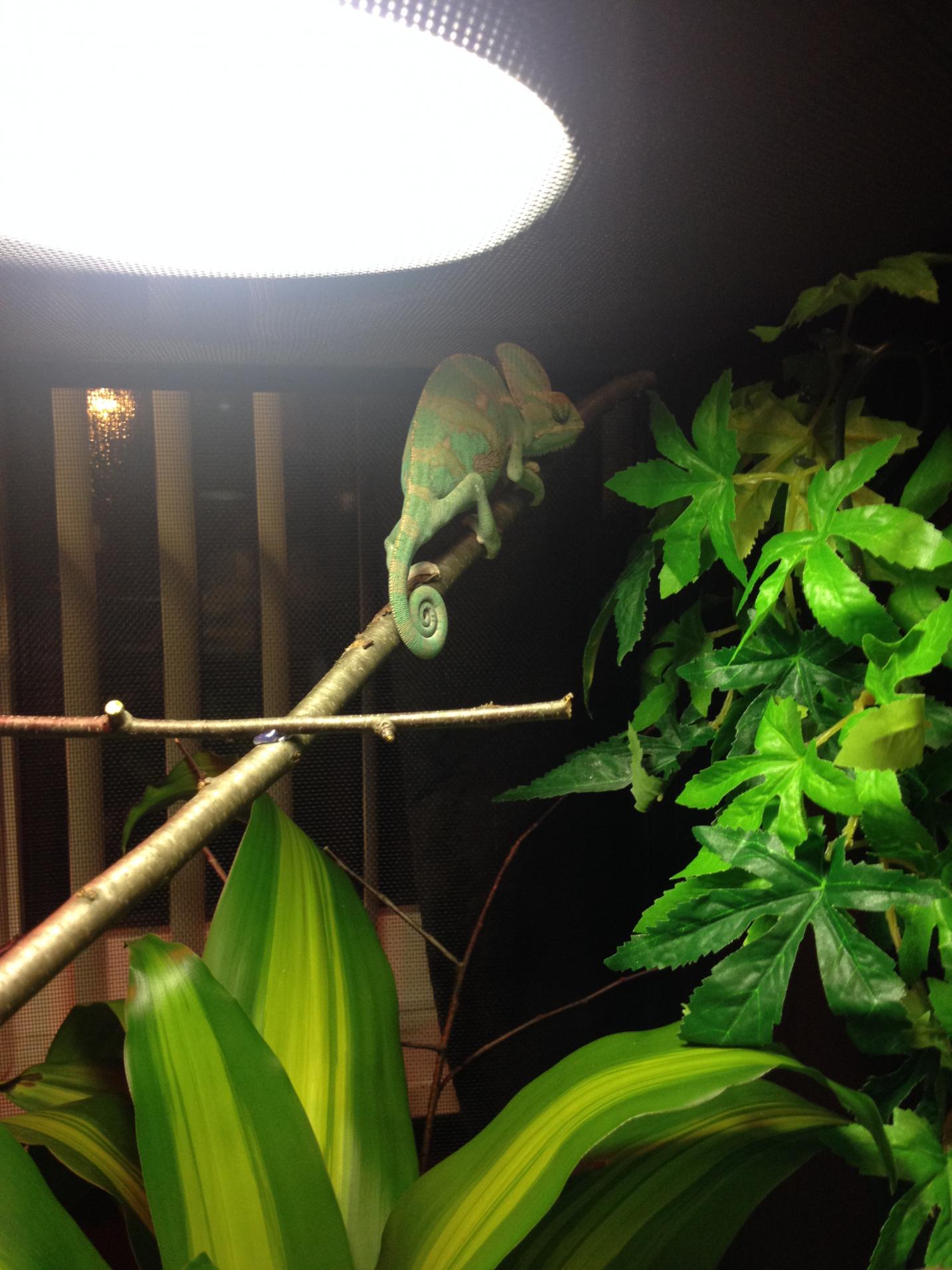I would also recommend using a light canopy with flourescent tubes to get more light into the enclosure. Chams don't need the red light. You need a simple flourescent white one for heating and a UVB for UV. Many people use the Reptiglo 5.0 and it seems to produce good results. 10.0 can be a bit strong and may cause problems with your veiled's eyesight. Especially if he's still young.