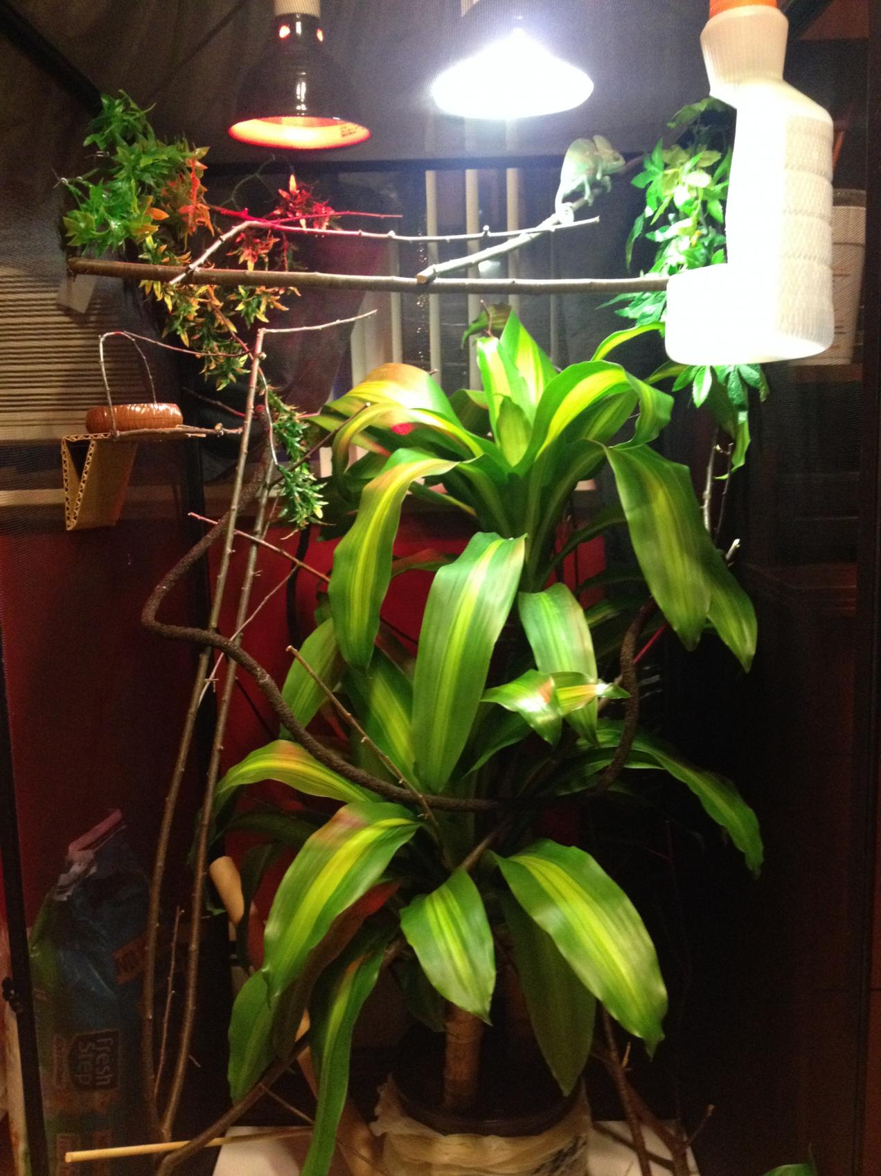 I can't see but do you have anything covering the soil in the plant pot? You should use large rocks or possibly some mesh to stop your cham from ingesting the soil. If he starts deliberately eating it that is usually a sign of a nutritional deficiency but he can also accidentally ingest it if he shoots for food that escapes and ends up there.