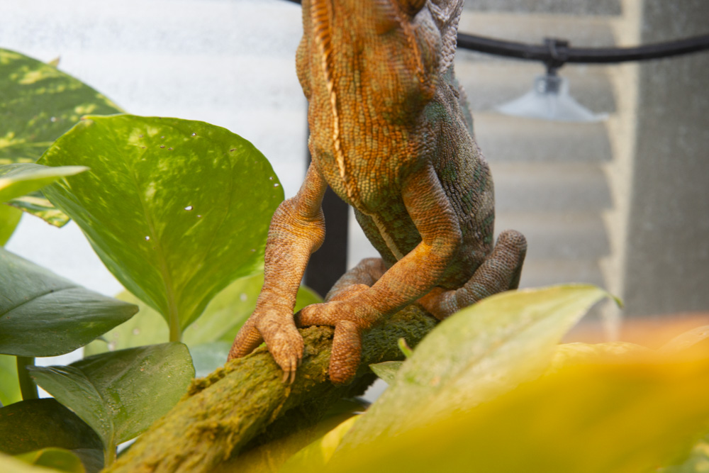 The set up is fully bioactive so there is an earth worm compost, but it's mostly covered with vines (the pothos, which is on a stand, has long vines which have set roots in the soil). He very rarely has contact with the soil itself, rather climbs on the vines or sticks. I feed him by putting bugs on the ceiling, which he like to shoot at from his basking spot or other high-up spots (i.e. I've never seen him hunt on the ground, and my desk is next to his terrarium so I'm there most of the day). No bark, and the drainage layer is several inches below the surface. There are some ferns and little trees, and they're all from a chameleon-approved list.