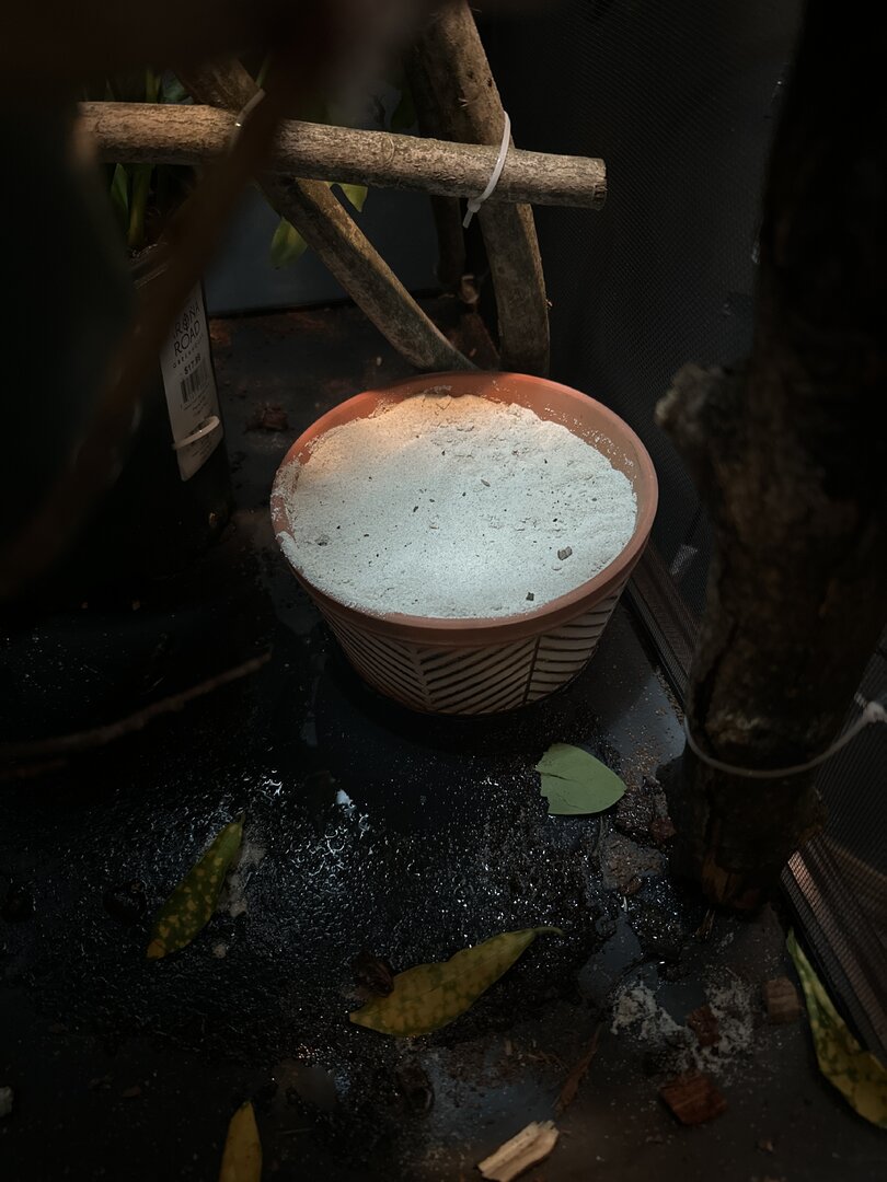 - Feeding - I am feeding crickets right now, as she is not interested in dubias. I feed her about 5 crickets around 10am and leave about 10 in there for her to graze on. I am not gut-loading at the moment, I’m still figuring out how to store my crickets, which I’d like some feedback on!