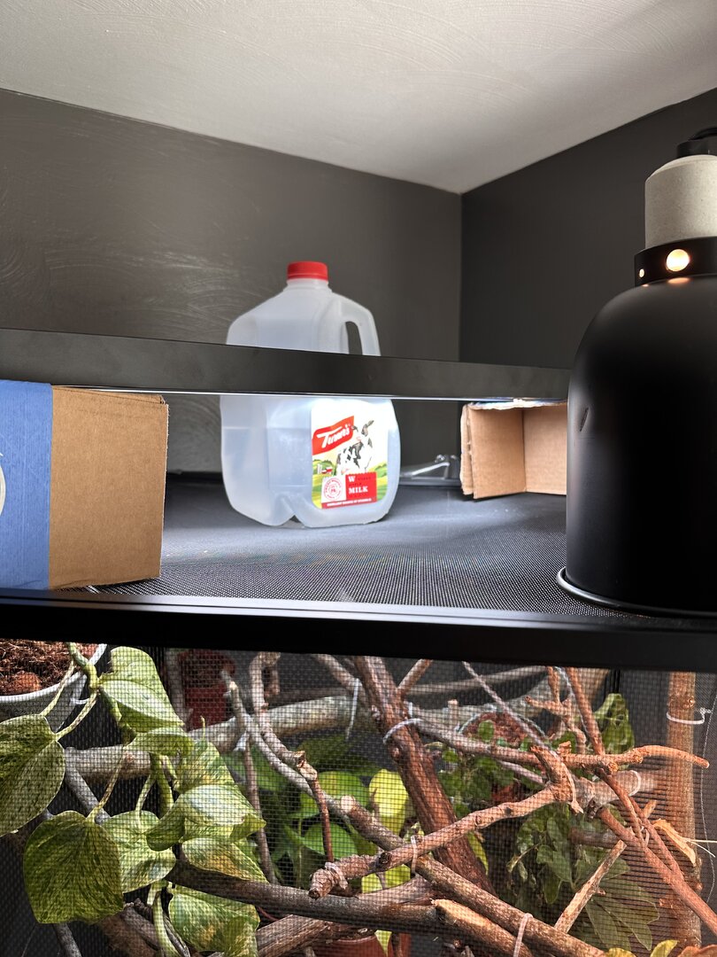 - Watering - I have a milk-jug dripper in place, dripping onto leaves below. She has taken an interest in the dripping water, but sometimes tries to drink it from afar, extending her tongue as if catching food. In the old enclosure, she mostly drank off of the glass, so I did add a small piece of plastic on the side of the enclosure if she’s more interested in something like that. I mist for 3-4 minutes about 30 minutes before lights off, and periodically through the evening as needed.