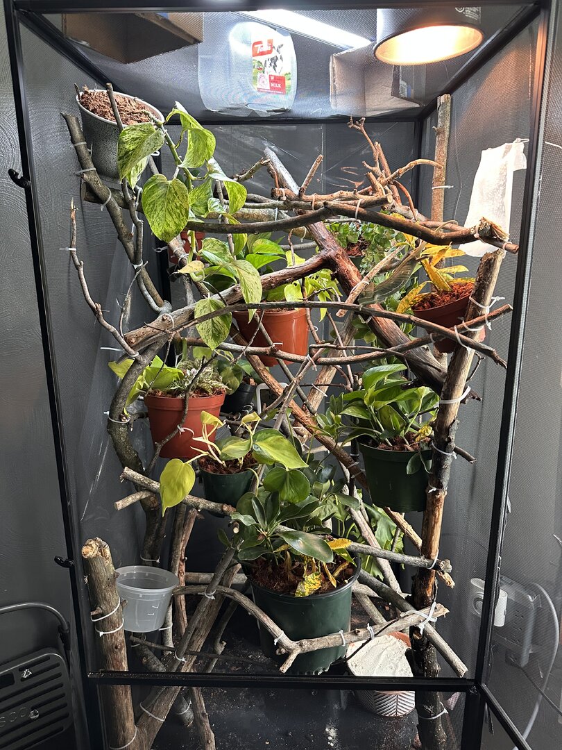 - Humidity - during the day, humidity is between 50-60%. Half hour before lights out I will mist for about 2-3 minutes, following up throughout the evening as needed. I would like to avoid buying a fogger, but I think I may need one, since the humidity drops pretty quickly. Unless I could add plastic to the front and right side at night, but then I’m worried about airflow.