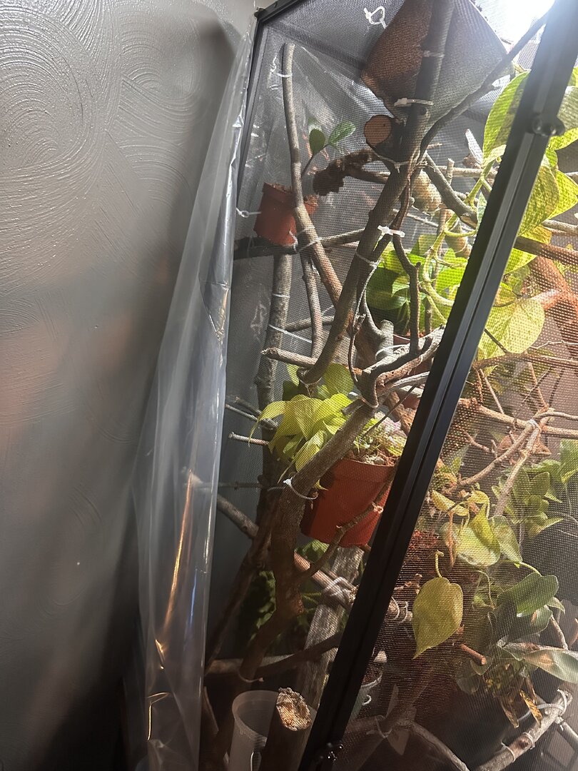 - Cage Type - XL Reptibreeze, I have a plastic sheet on the back always, and halfway on the left is open during the day, and at night I put it up fully (back and left side) to maintain humidity.