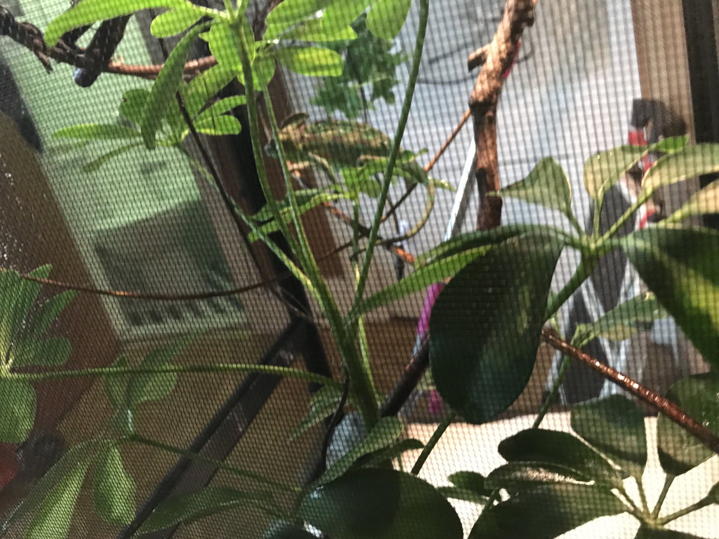 Fake plant, fake vines, real branches, umbrella plant, rocks over soil.