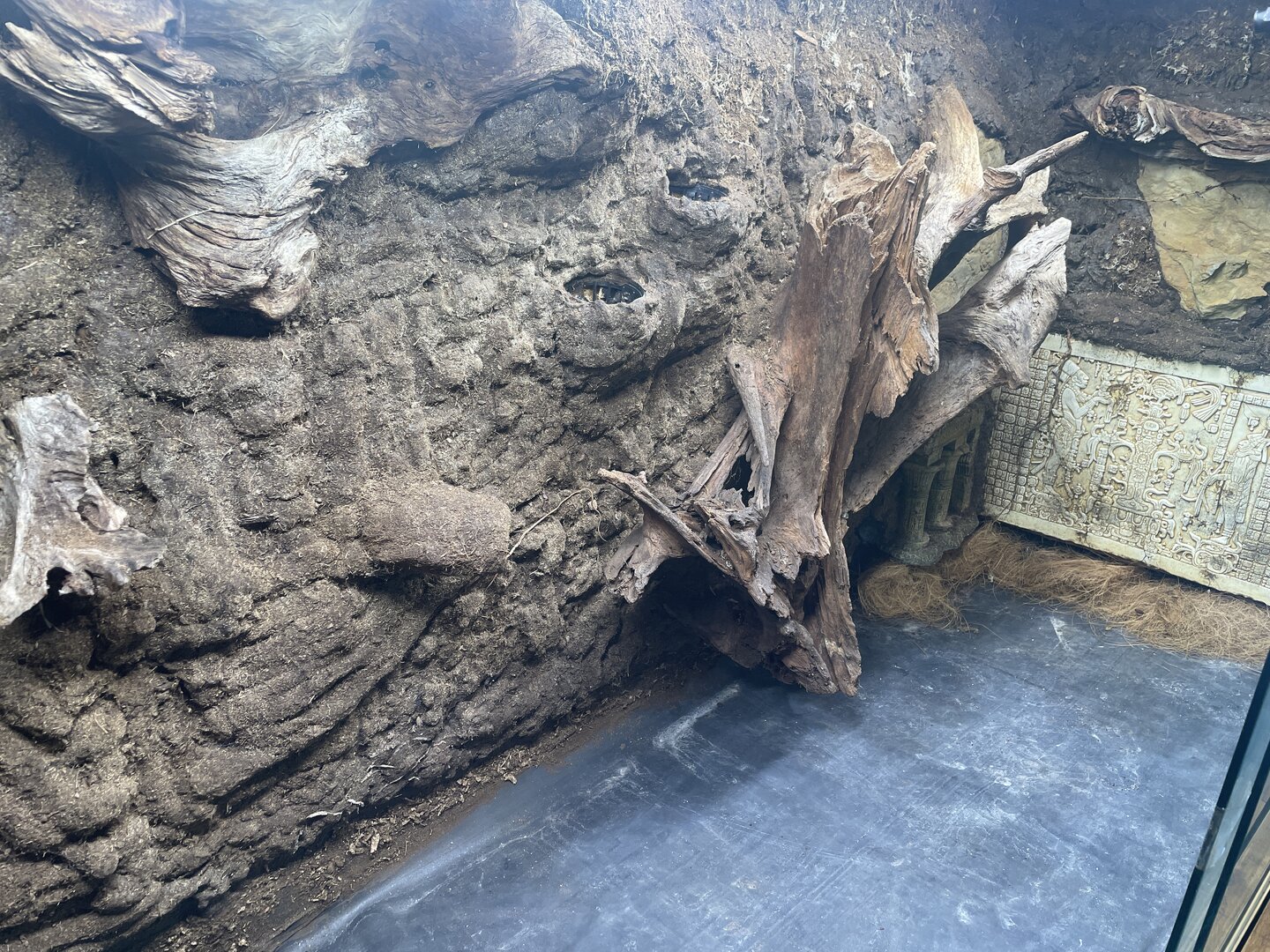 The enclosure if made of wood and sealed with epoxy, with glass doors. The walls are foam with brown caulk covered with peat moss. Malaysian driftwood is gorilla-glued on to the walls. The temperature and humidly are controlled by two exhaust fans at the top back of the enclosure, where the chameleon can't get to. There are also two small computer fans inside (set on low) to keep the air from being too still or stagnant. The bottom is EPDM (pond liner) that slopes slightly to the back to two drainage holes: