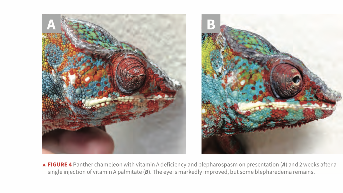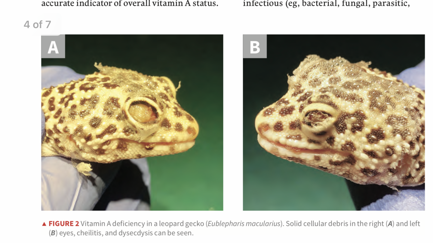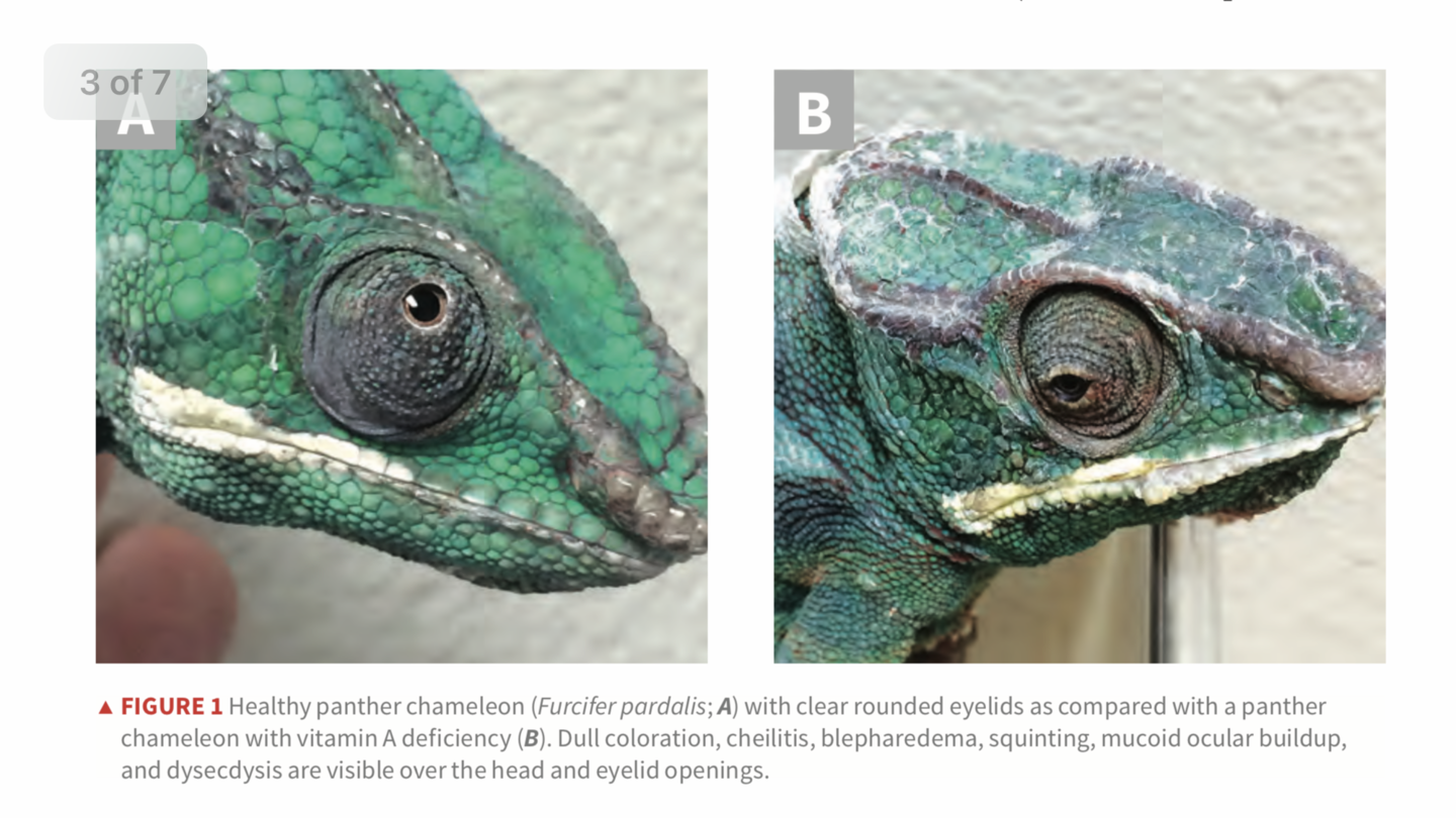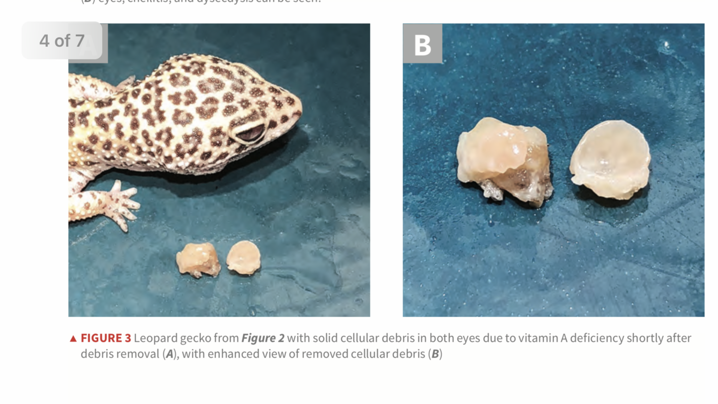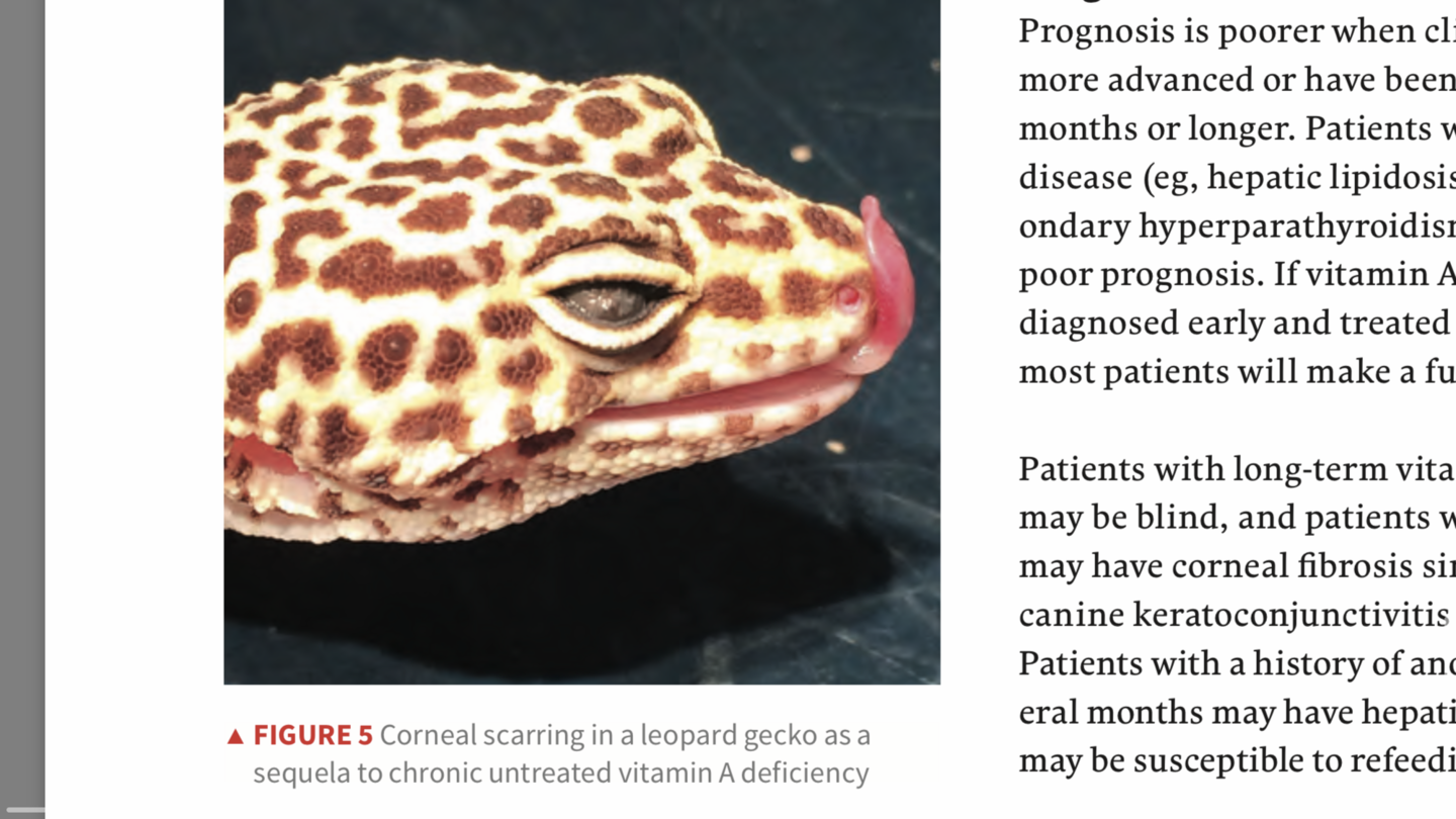 This was very helpful. I am certain that Penne (now 1year old) suffered/suffers from Vit A deficiency and as a result has the blepharedema and debris / keratin buildup under the eyelids. Two trips to the vets, and a course of antibiotic eyedrops (and oral antibiotics) were not effective. Penne was given Repashy's LoD, along with the rest of the group, since she joined us in August. I took everyone off it in January, when Penne's issues began to develop (along with other mild behavior changes with the group). I have no idea if LoD is to blame, but the group gets a large variety of well gutloaded feeders, so LoD seemed like a good place to start.