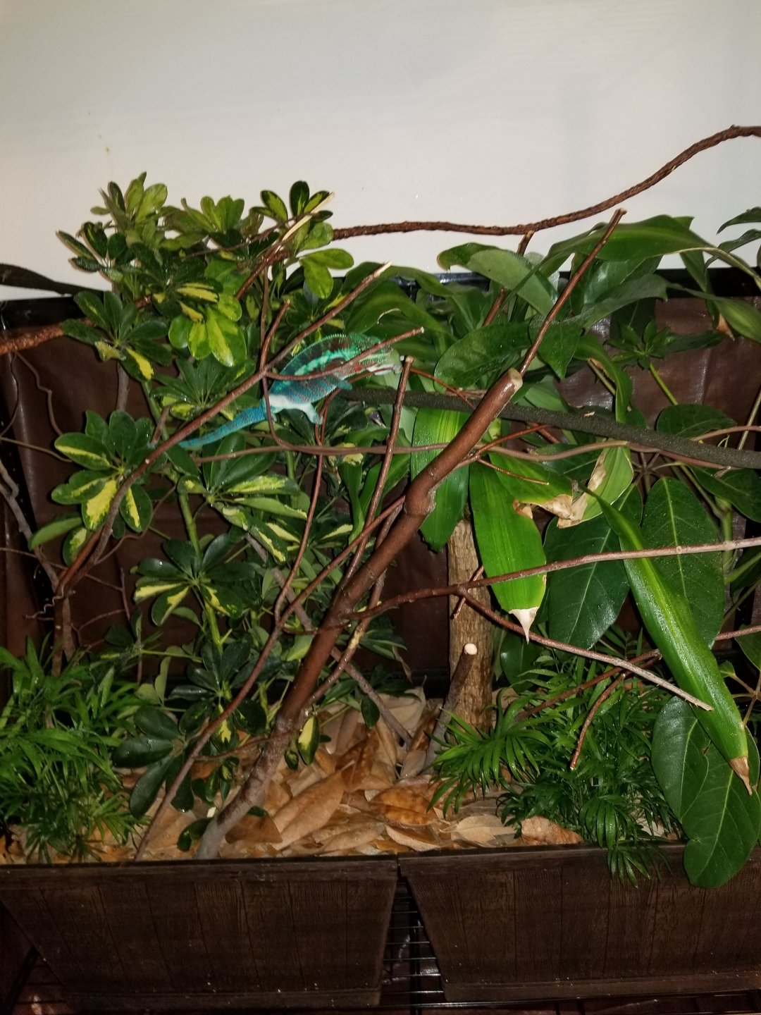 Yeah let me find it, it's not the most detailed thread, but I just tore down what I had set up there. Now it's cleaner and organized. Tomorrow I'll get some pics of the lighting(it's up out of the picture-jungledawn,basking,t5arcadia12%).. I still have some last minute things to do but it'll have to wait until tomorrow. It's all on a wire shelf. Drainage below and lights on top. I'm doing this for my other 2 panthers next ahhh. There are tons of plants in that room, the ambient humidity stays at 50% lowest, but I might look into a fogger or humidifier of some sort for the added cushion.