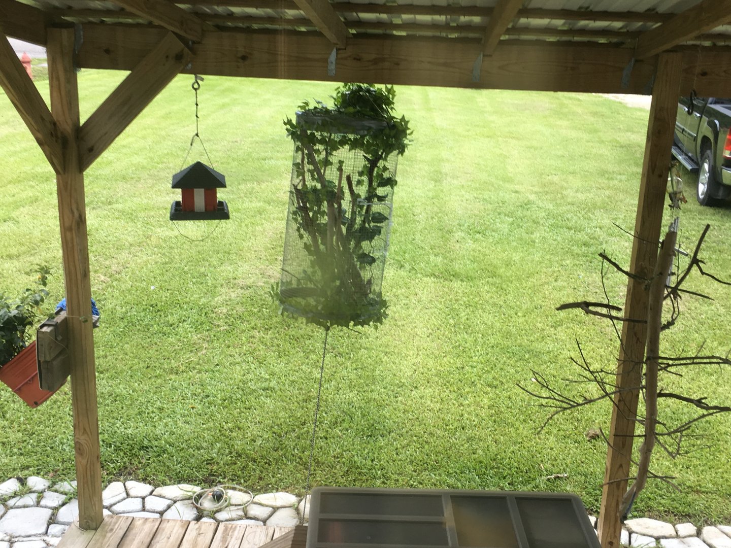 Btw - that stick thing with all the branches in the right side of the pic is an extension of his enclosure that I hang next to the screen section so he can go back and forth at will. But I only do this when I'm staying close by.