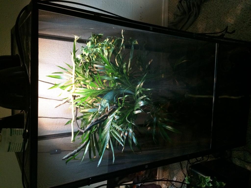 I have an Exo terra monsoon mister (information on the duration of spray and how long would be great), 5.0 reptisun bulb, night bulb, basking heat bulb, large Uvb, large live cat Palm plant, multiple bamboo sticks,