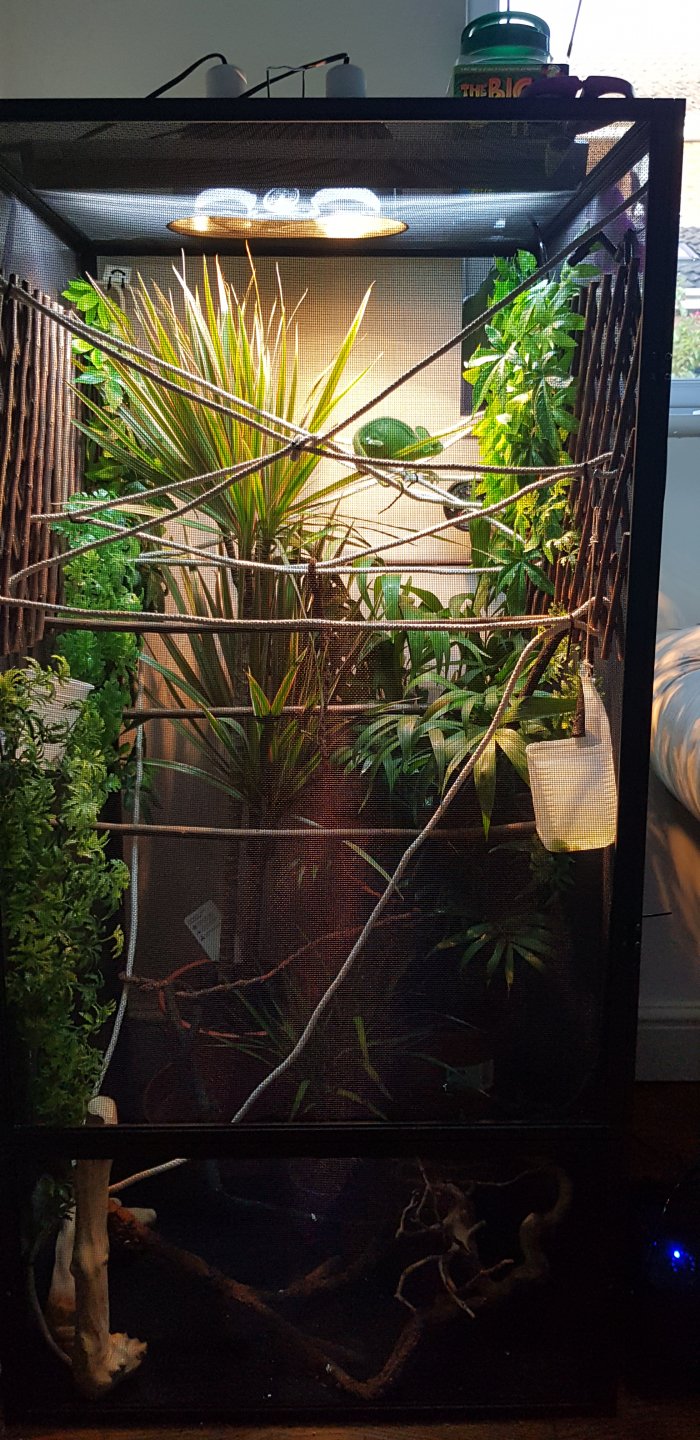 Its a reptiibreeze xl 120 high so ive already got it in an adult cage.t5 strip light ontop. Double dome but only one on with 75 basking bulb temp 33 underneath today. Monsoon system 2×60sec a day 8 hours appart. Big dripper on top. Calcium without d3 3 days arcadia earthpro a without d3 4days and 1 days repashy calcium plus 1 day on gutloaded marios, locust and sum calcis and wax worms thrown in. Wax worms addhoc for good behaviour.