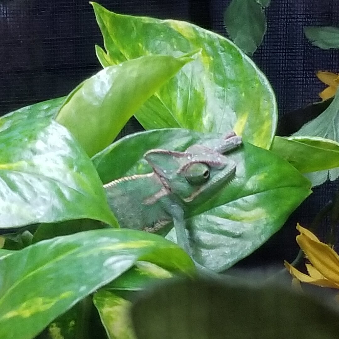 I have two outdoor wire mesh and wooden aviaries that are about 30"x30"x60". They have an automated misting system. They also have live Ficus and pothos and some grape vines. Two feeding bowls. They are in my back patio. I'll be letting my chams live out there when the weather is not too hot for them. Any time it will be under 82 degrees. And above 55 degrees. That is probably 3 or 4 months out of the year.