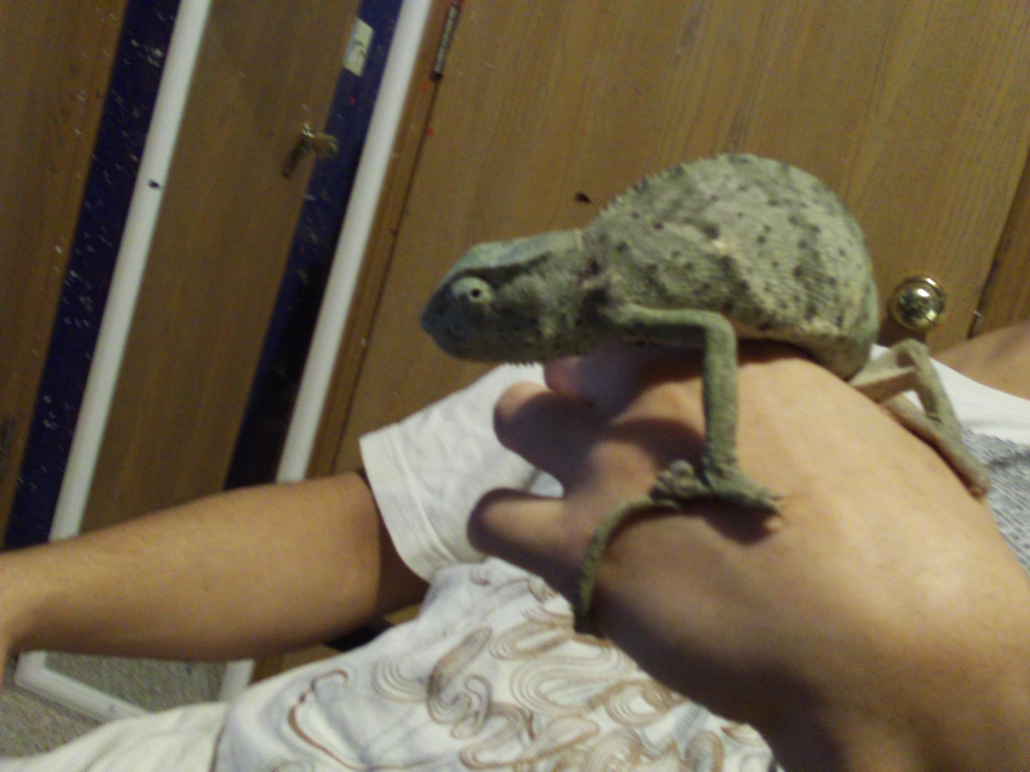 chamaeleo dilepis dilepis (flapnecked chameleon), congrats he is cute :) acclimate him well. he looks a bit stressed. leave him be, make sure his humidity and temps are right and offer him plenty of water through misting and/or dripper, and offer him a good couple feast. find out what sex it is aswell