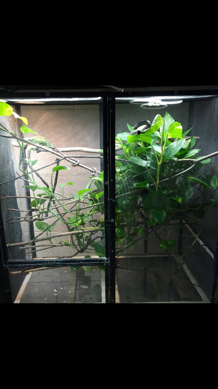 Humidity - We stay in the 65-75 range. There are short periods of lower humidity. Usually in the morning. Occasionally I've seen humidity in high 80s-low 90s right after a session. His aquazamp and large pothos keep it nice and humid. In the winter I usually have to cover a side or two. I have a digital humidity gun type deal. I also have those round cheap humidity things but I don't really trust them.