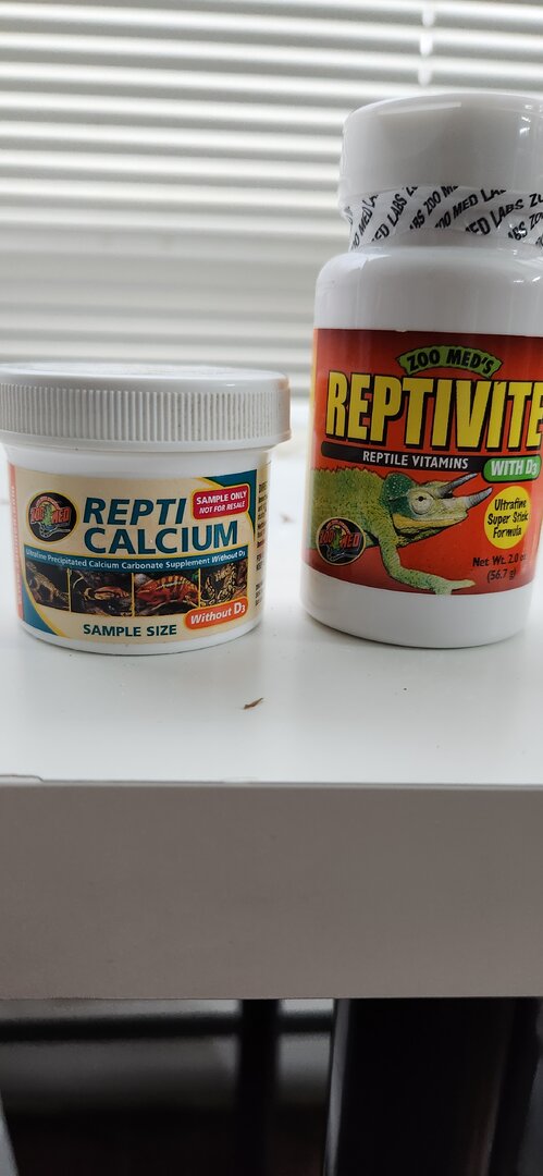 Supplements - I dust calcium in every feeding. Multivitamin twice a month. 15 and 1st of the month. Reptivite just today. Before it was repashy without calcium.