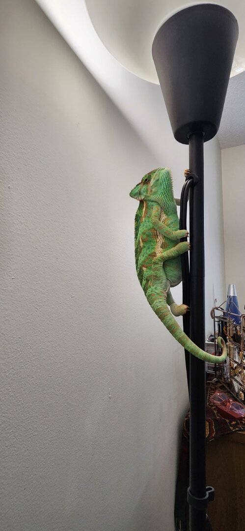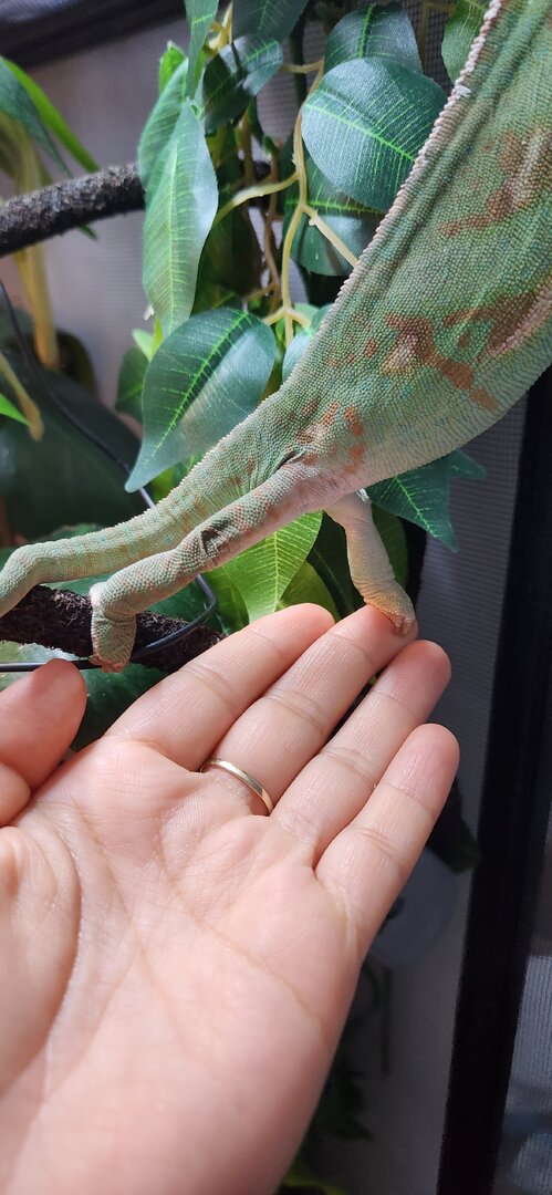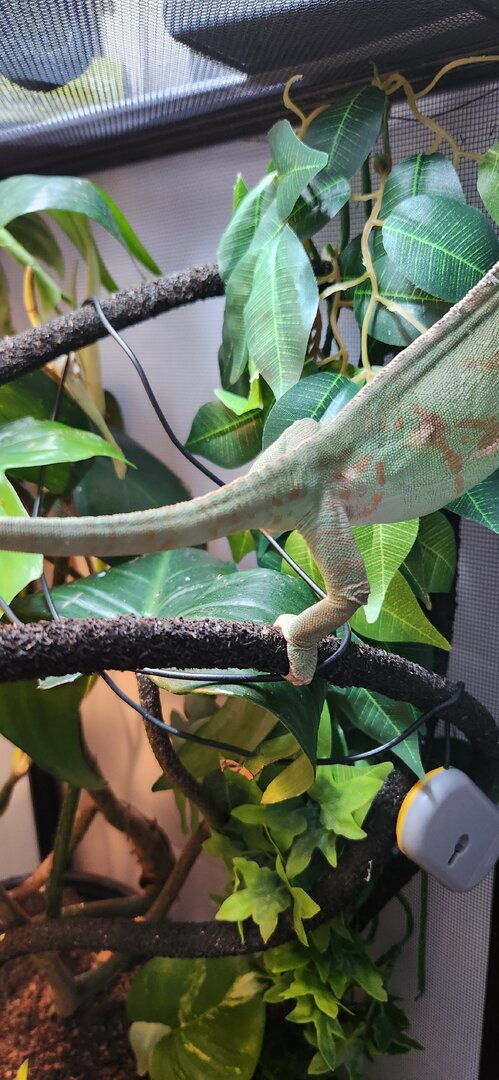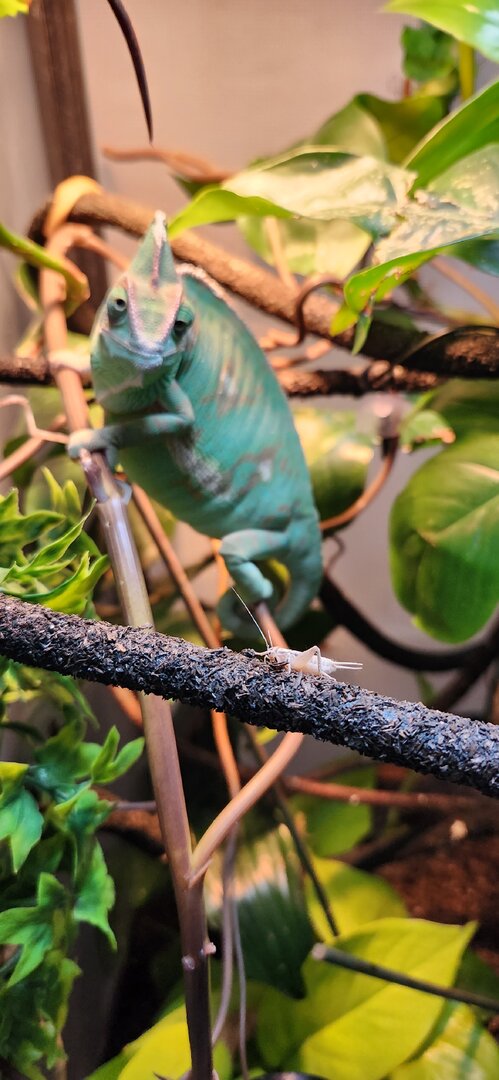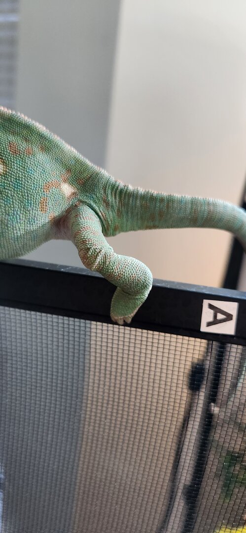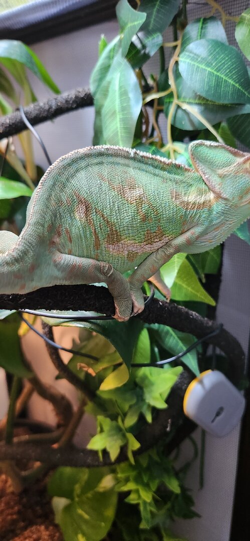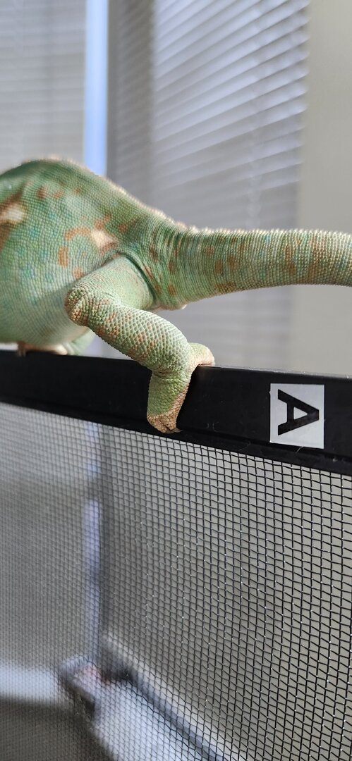If the crickets are getting out, place some food at the bottom of the enclosure for them. Then they won't be as tempted to bite your chameleon. (If that's the issue). Your girl is pretty, love seeing those leg muscles!! You are in good hands with @Gingero and @Beman and @kinyonga - they help a lot of people and have great experience!