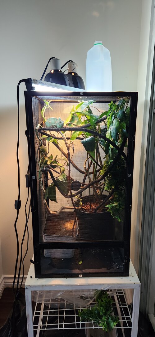 Lighting - T5 HO 5.0 UVB... This is good but your distance from this fixture to the branches is too close. You need 8-9 measured inches to put her in the right UVB level. Raise the fixture up or drop the branches down to accommodate this.
