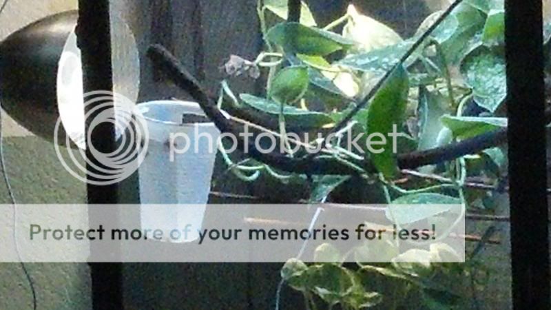 Not very clear Cuz its from across the room. Eye balling the cup looking for his next snack.