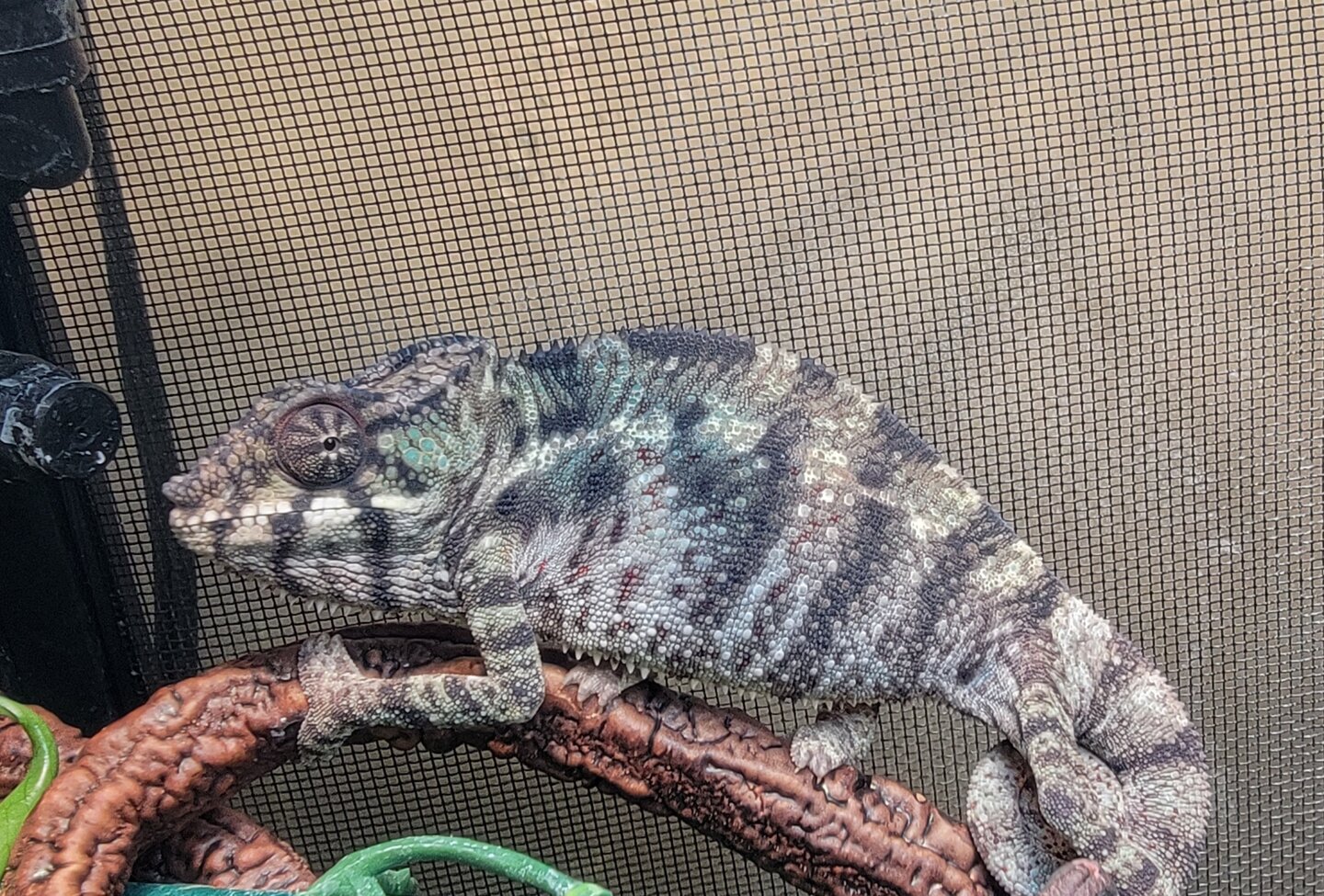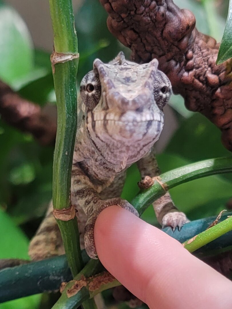 He seems to be a fine weight, his casque isn't puffy or anything, though I'm not sure if I should withhold food (like every other day) just yet or not. He also seems to be on the slow end for colors coming in as well... The pictures of younger chams on their website are SO much brighter/more colorful. :/